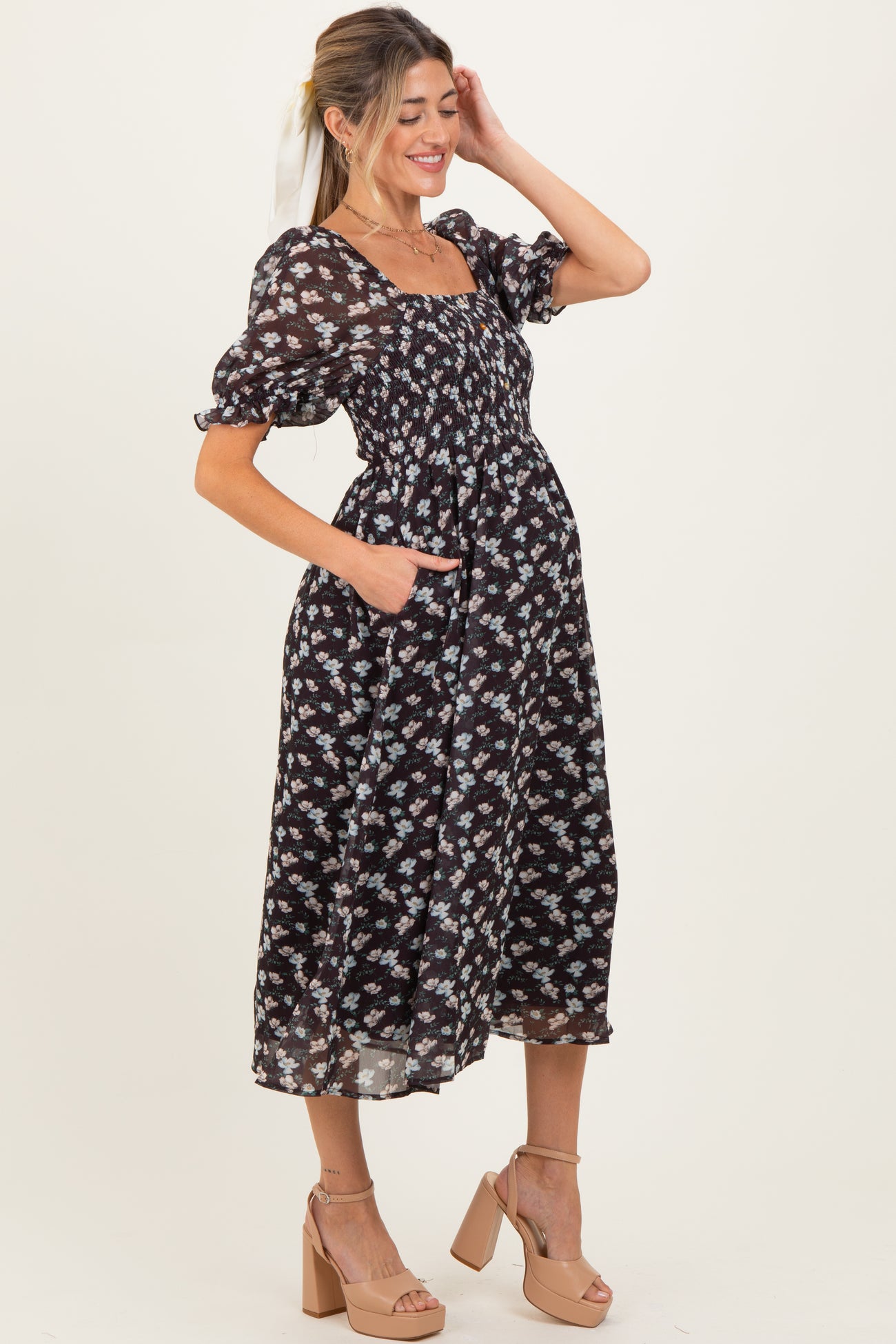 Embrace effortless style and comfort with our Brown Floral Smocked Puff Sleeve Maternity Midi Dress. Featuring a flattering smocked bodice and delicate puff sleeves, this dress provides gentle stretch and room for your growing bump. The charming brown fabric adorned with soft floral prints offers a timeless, feminine look. Designed with a square neckline and front button details, it’s perfect for both casual outings and special occasions. The flowy midi length enhances movement while side pockets add convenient functionality. Pair with sandals or heels to complete your chic maternity wardrobe. Ideal for pregnancy and beyond!