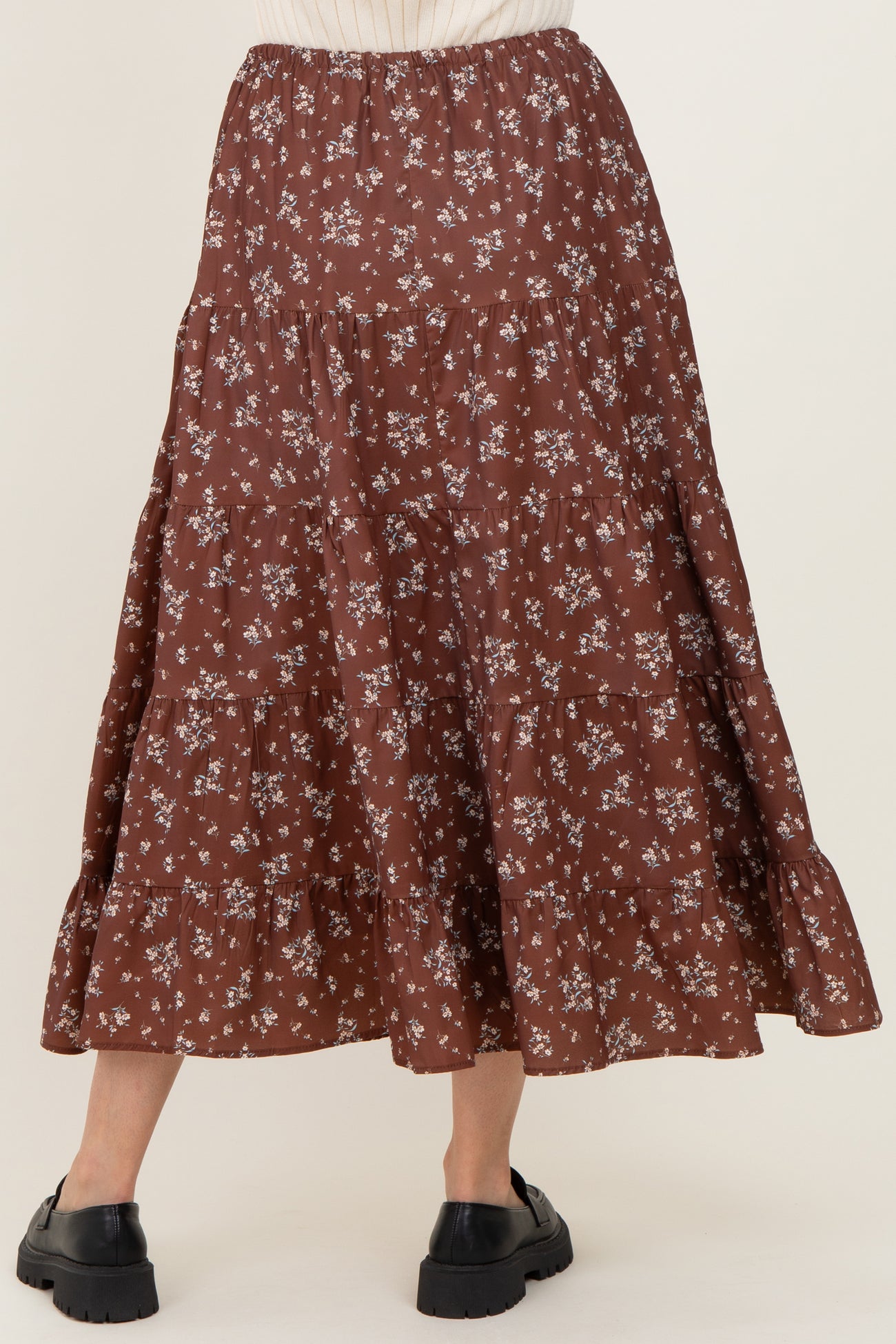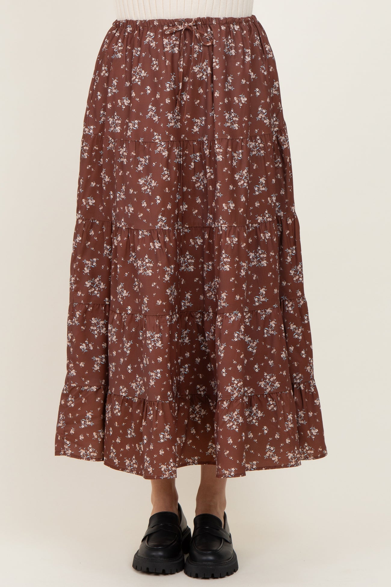 Embrace effortless style with our Brown Floral Tiered Maxi Skirt. Crafted from lightweight fabric, this skirt features a charming all-over floral print that adds a touch of femininity to your look. The tiered design creates gentle volume and movement, while an adjustable drawstring waist ensures a comfortable, flattering fit. Perfect for casual outings, work, or weekend brunches, this versatile maxi skirt pairs beautifully with casual tops, knitwear, or blouses. Elevate your wardrobe with this timeless piece that blends comfort and style seamlessly. Available in all sizes.
