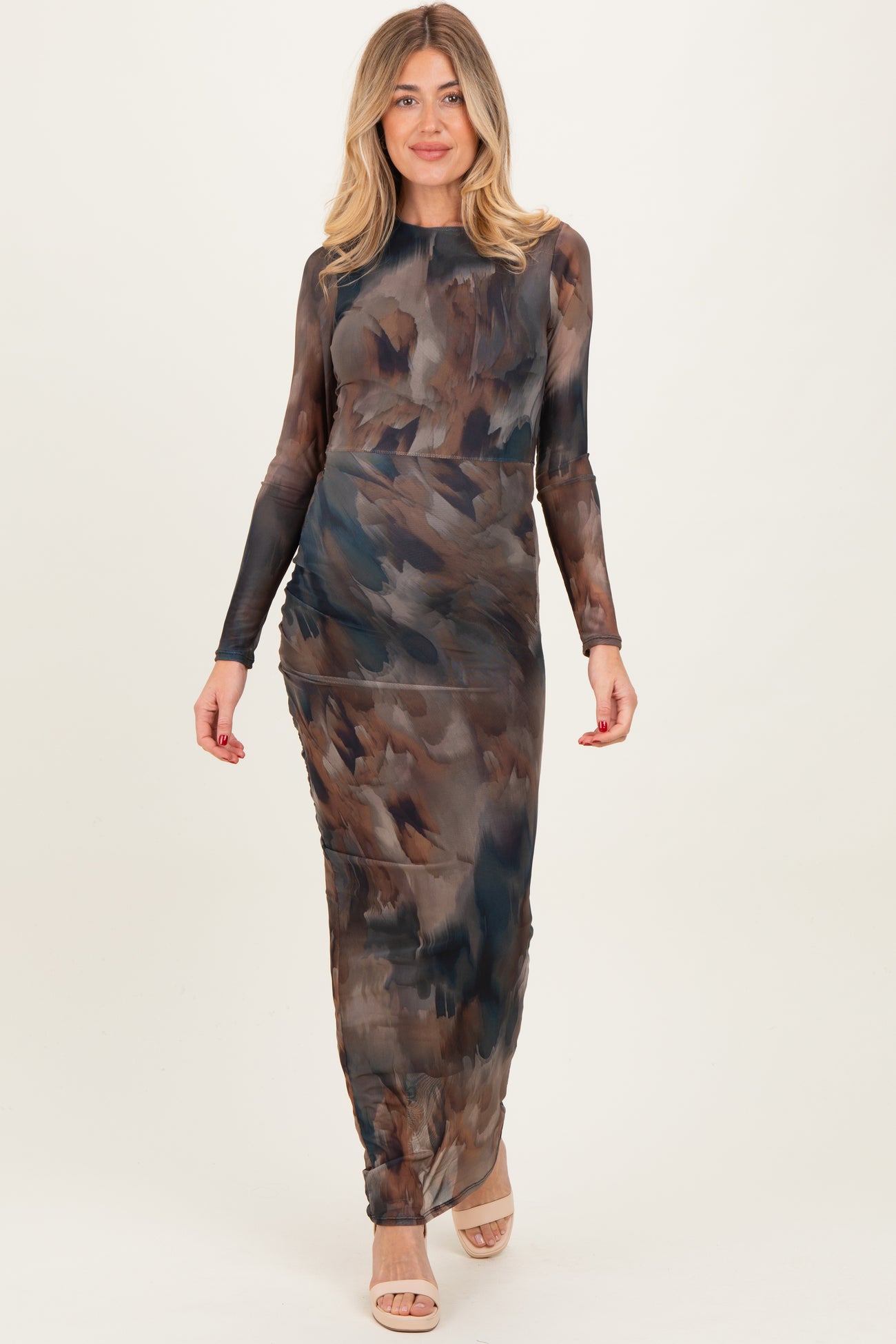 Elevate your maternity wardrobe with this stunning mesh maxi dress, featuring a unique brush stroke print that adds artistic flair to your look. Designed with a flattering silhouette, this dress gently hugs your baby bump while providing breathable comfort thanks to its soft, lightweight mesh fabric. The long sleeves and high neckline offer elegant coverage, perfect for day-to-night wear. Whether attending a special event or enjoying a casual outing, this dress combines style and comfort effortlessly. Pair it with your favorite sandals or heels to complete a chic, modern maternity ensemble.