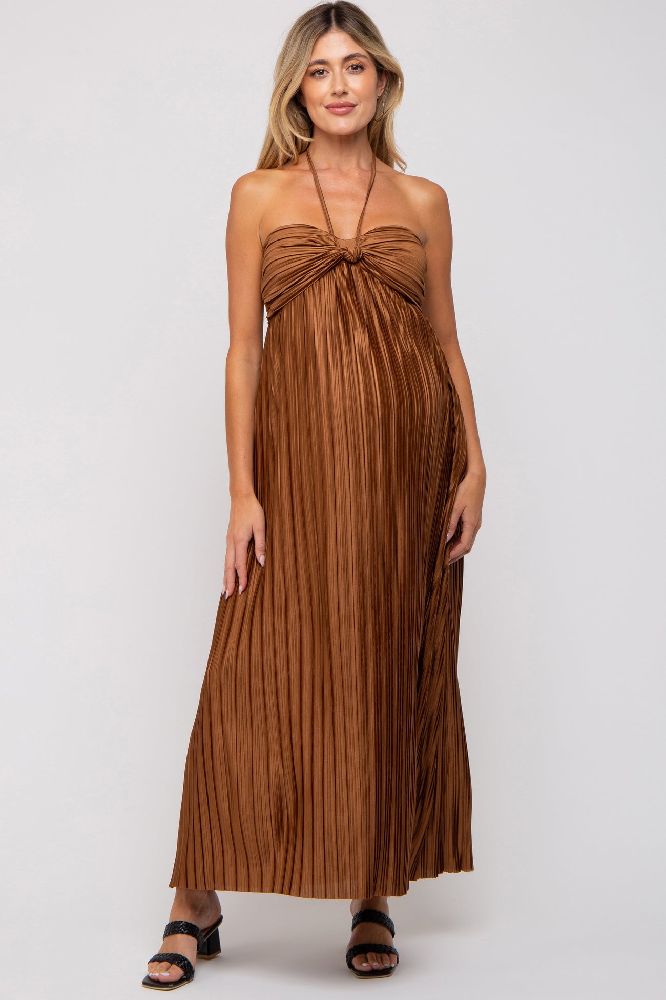 Brown Pleated Halter Maternity Maxi Dress