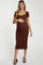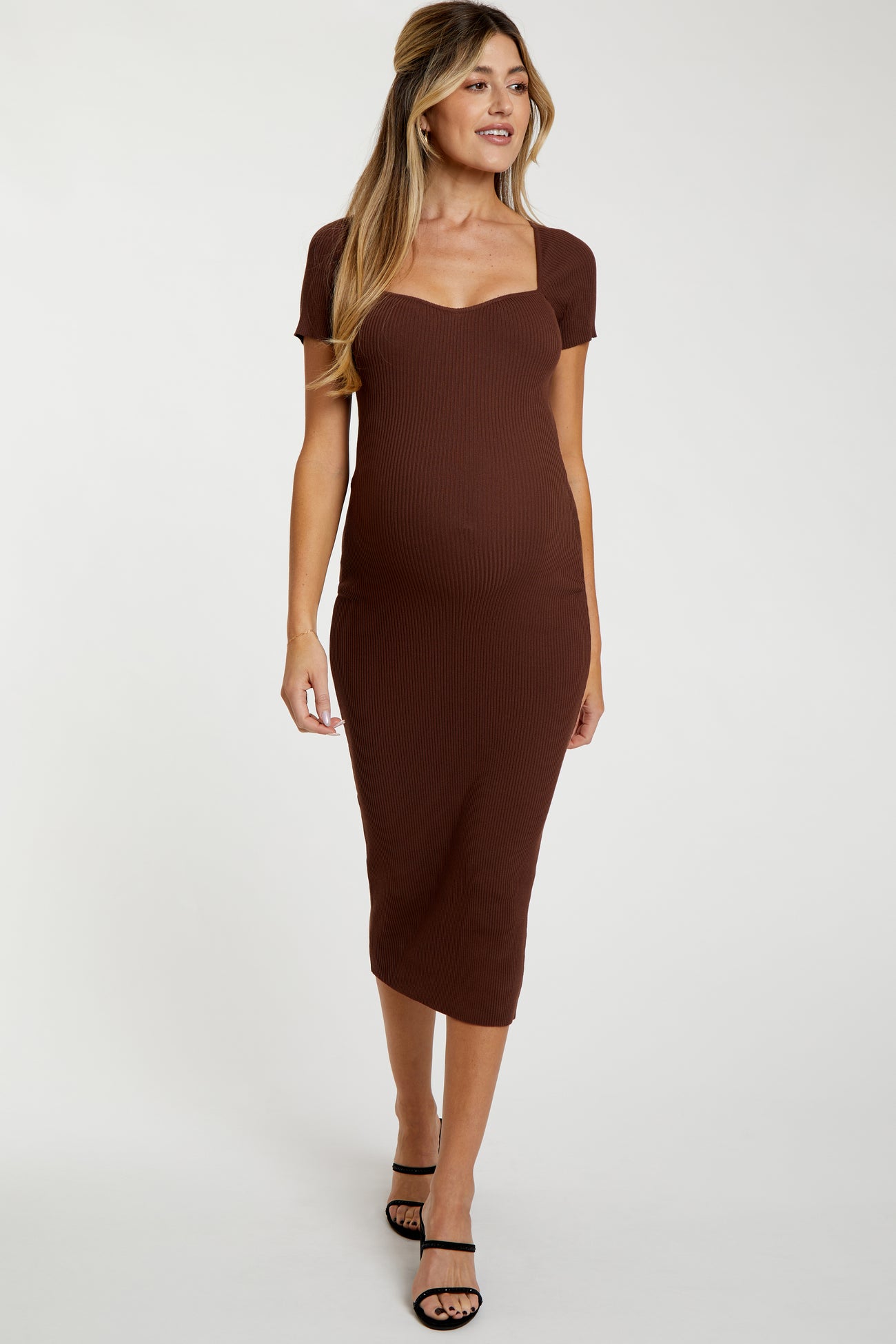 A solid ribbed maternity fitted midi dress with a square neckline.