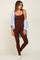 A rib knit, bodycon jumpsuit with a squared neckline.