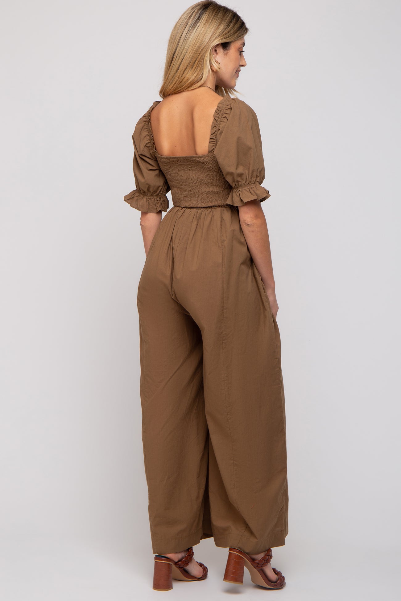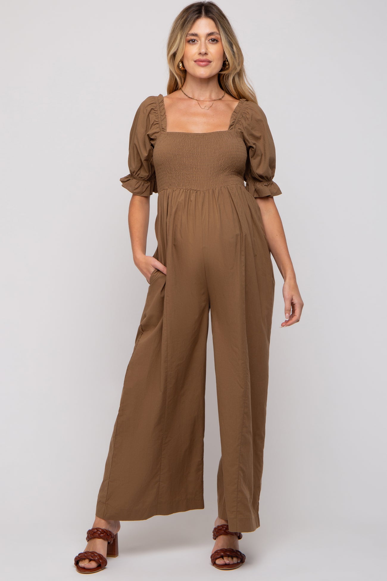 Brown Smocked Square Neck Wide Leg Maternity Jumpsuit