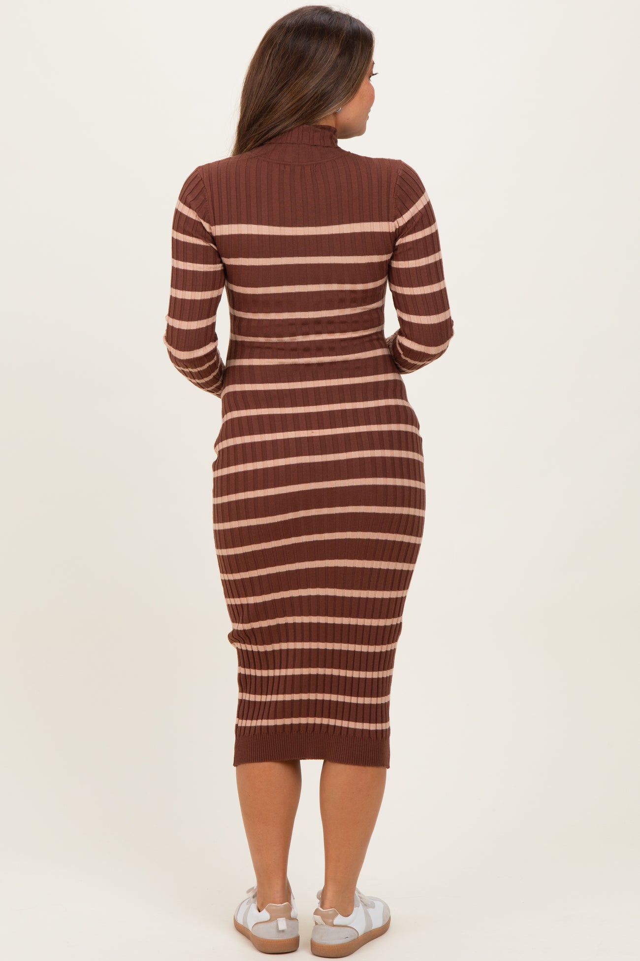 Brown Striped Turtleneck Maternity Midi Sweater Dress