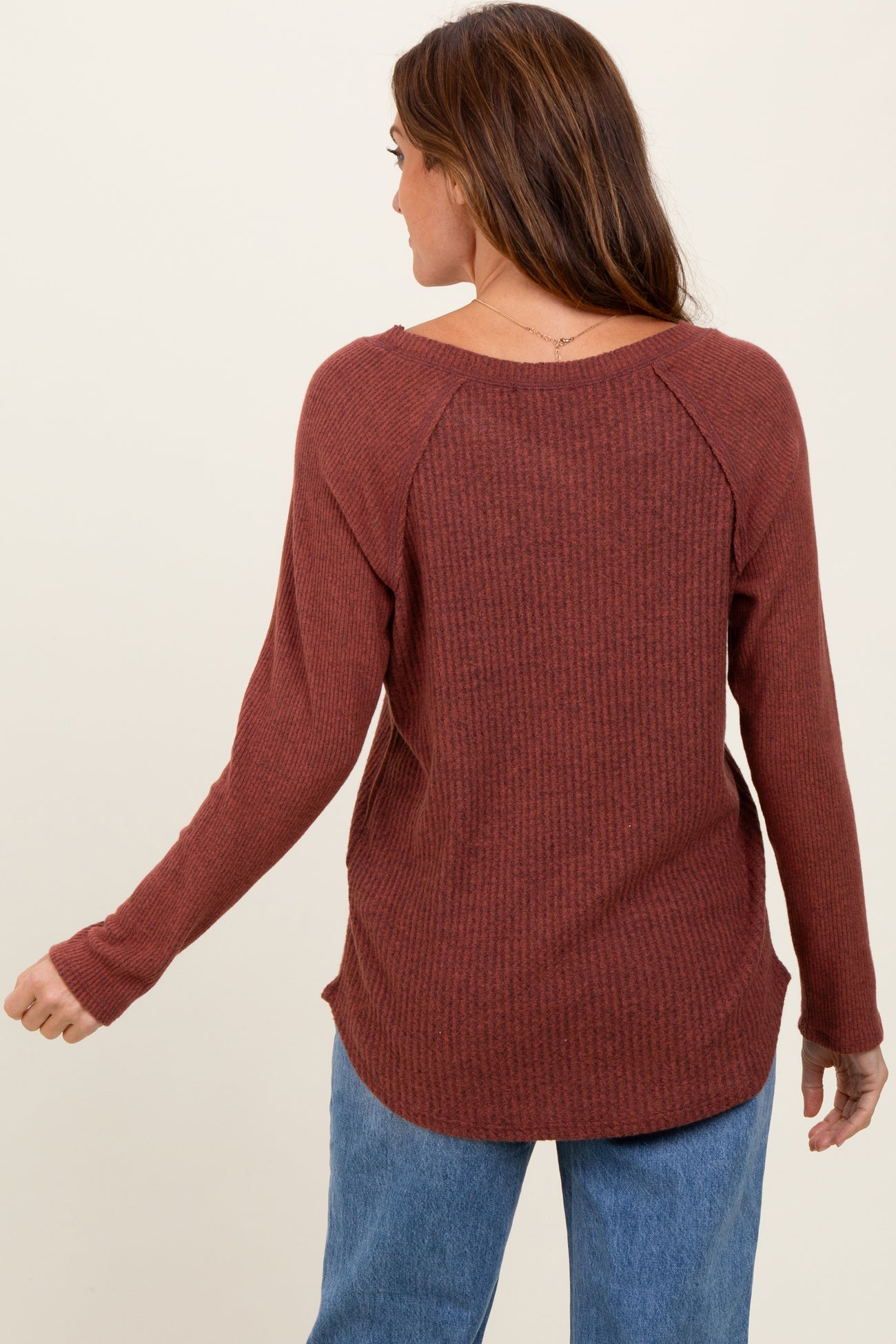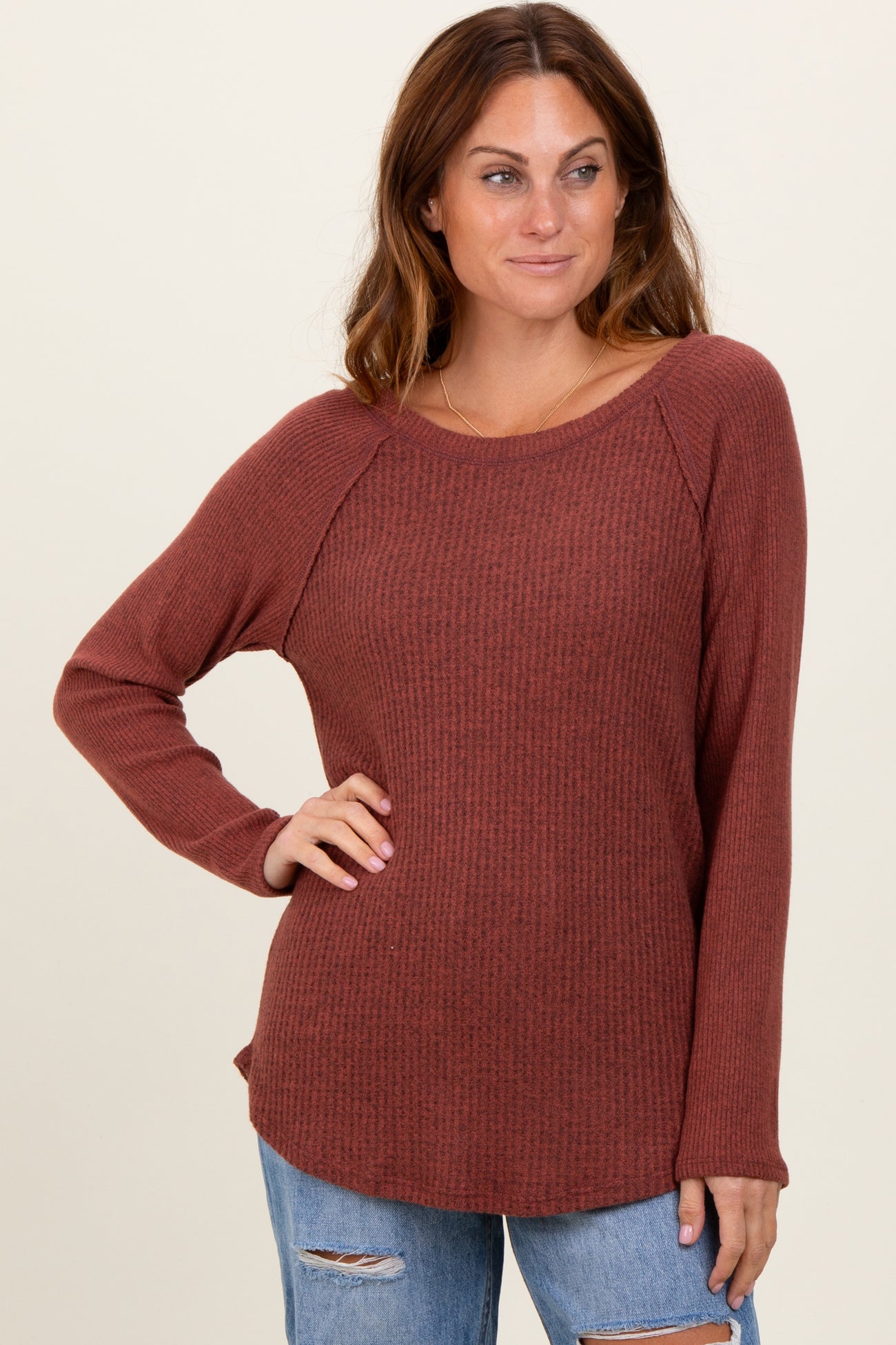 Brown Waffle Knit Raglan Long Sleeve Top