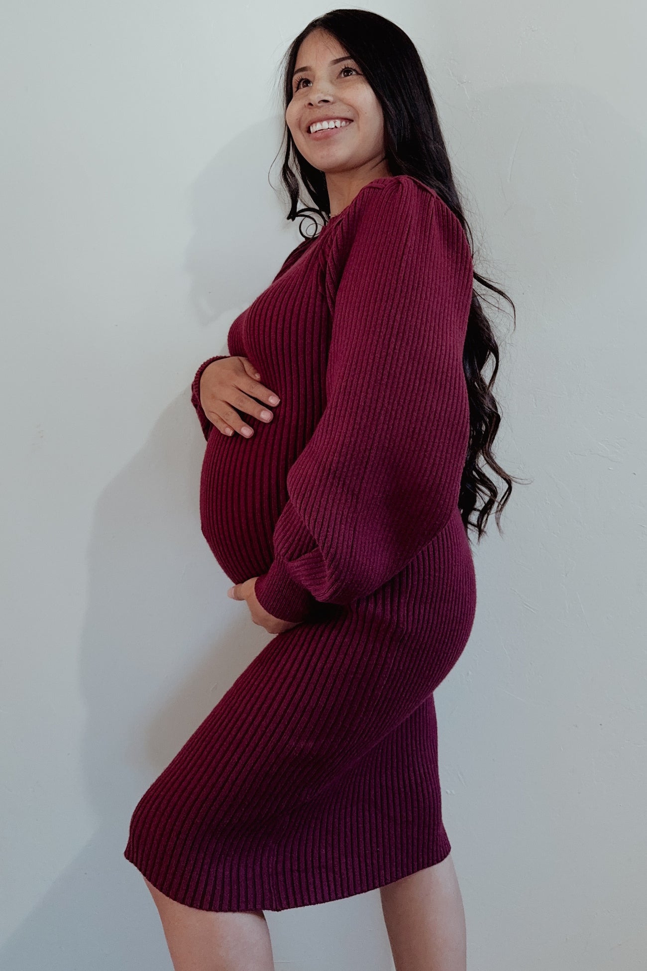 Burgundy Bubble Sleeve Maternity Sweater Dress