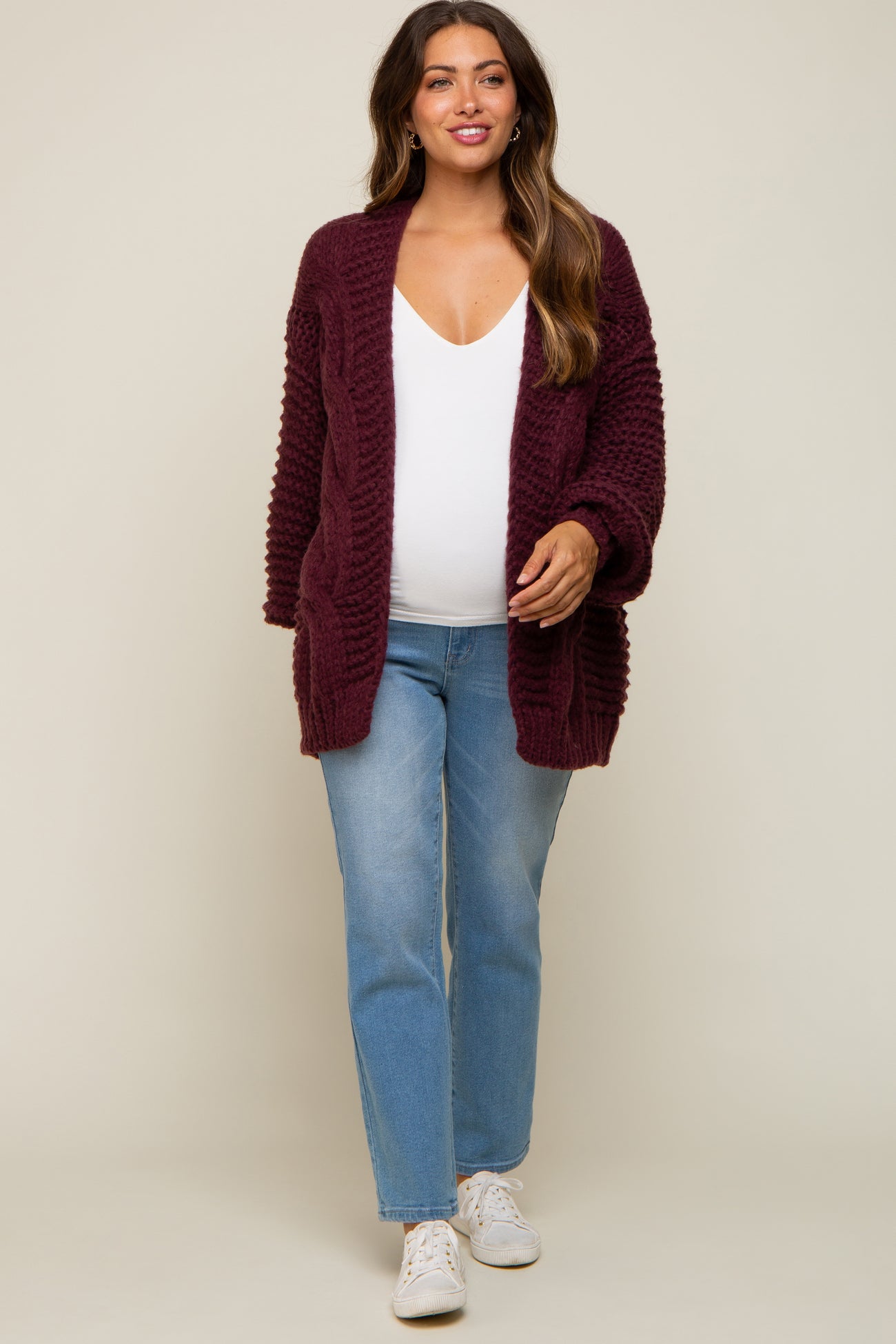 A chunky knit maternity cardigan featuring long sleeves and an open front.