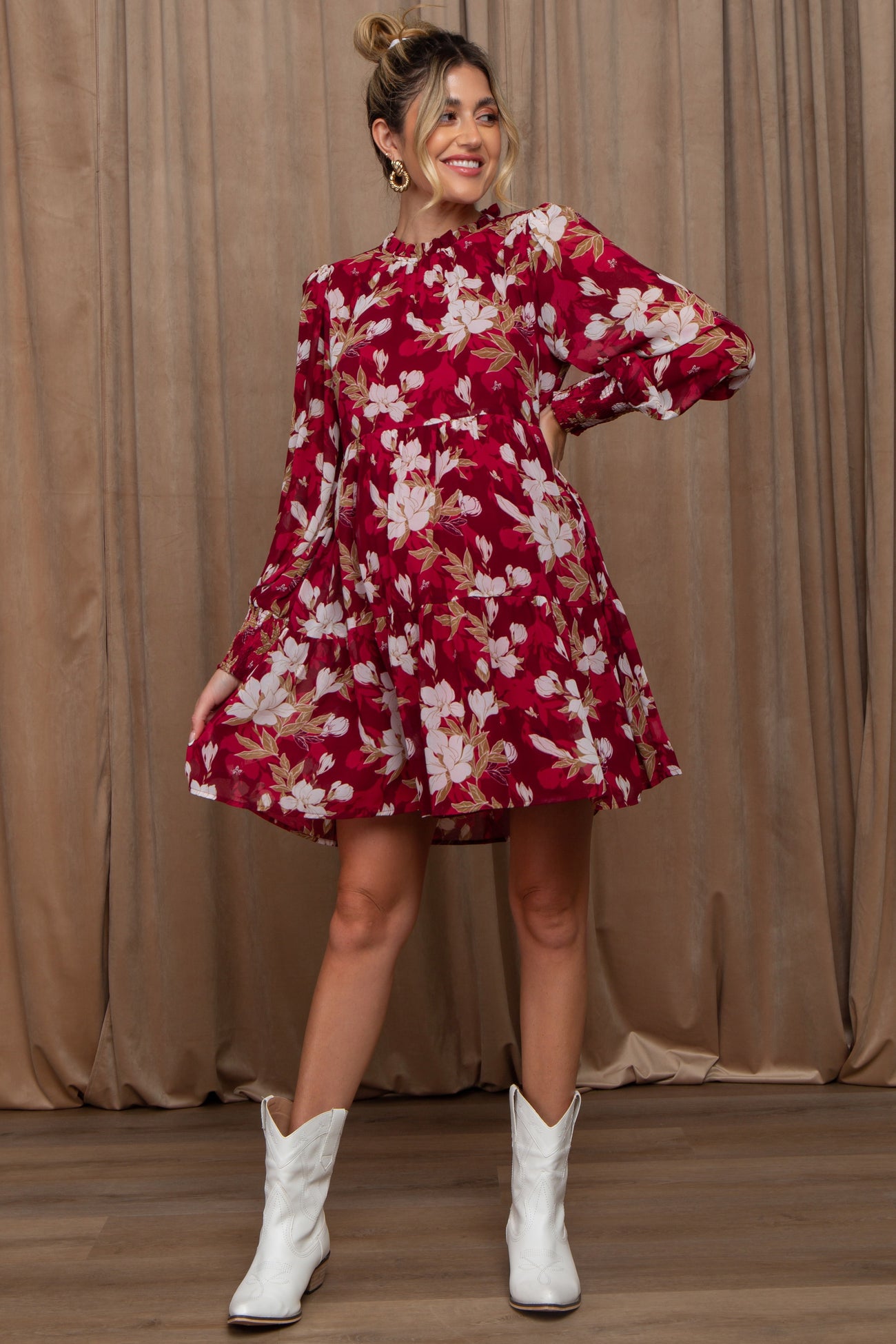 Burgundy Floral Chiffon Ruffle Mock Neck Tiered Maternity Dress