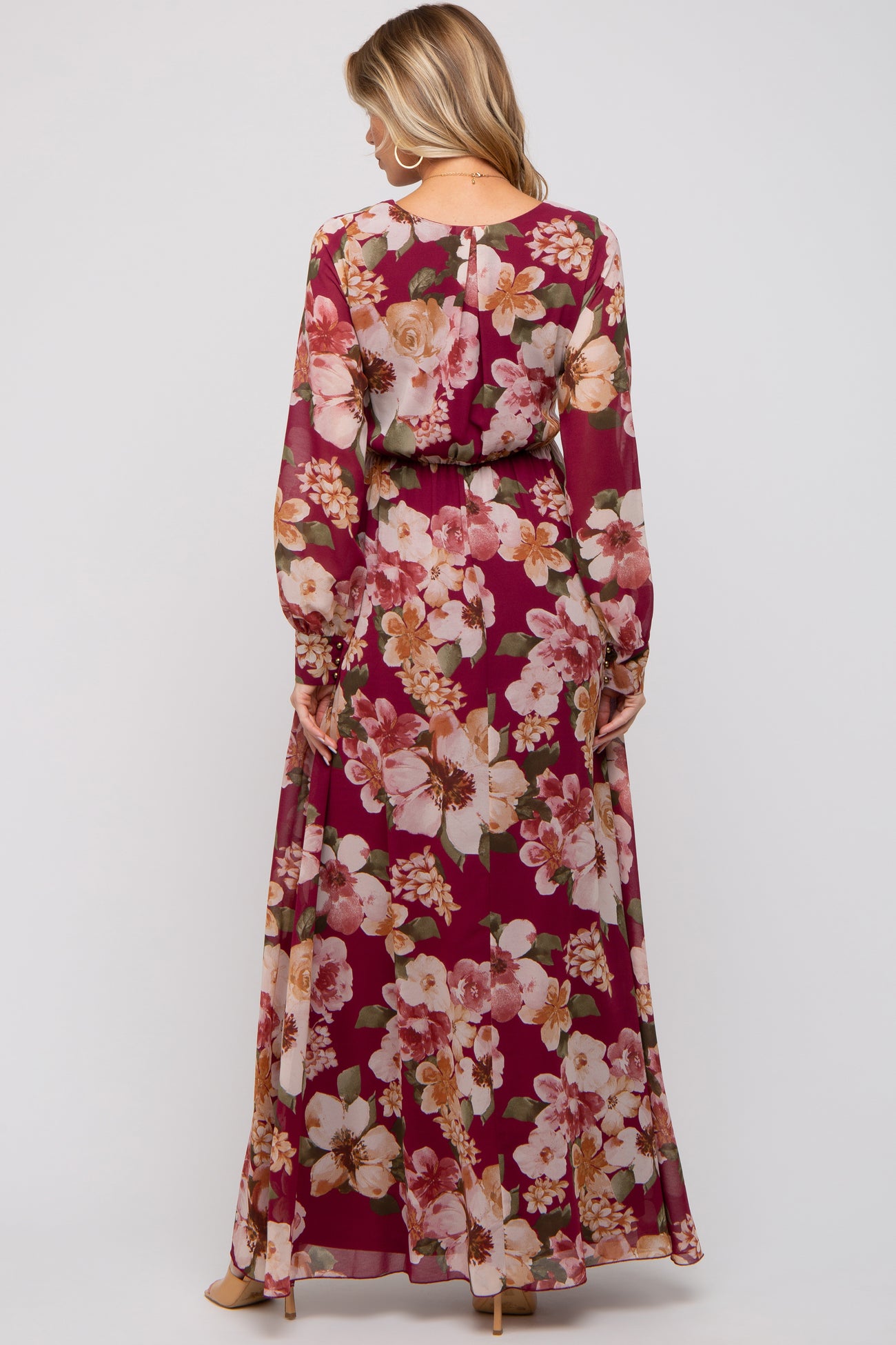Details A floral chiffon maternity maxi dress featuring a wrap front v-neckline, long sleeves with three buttons, an empire waist with an adjustable tie and double lining. Content + Care