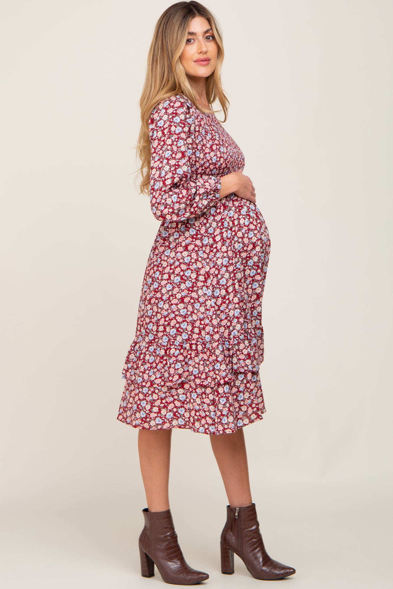 Burgundy Floral Smocked Long Sleeve Maternity Midi Dress