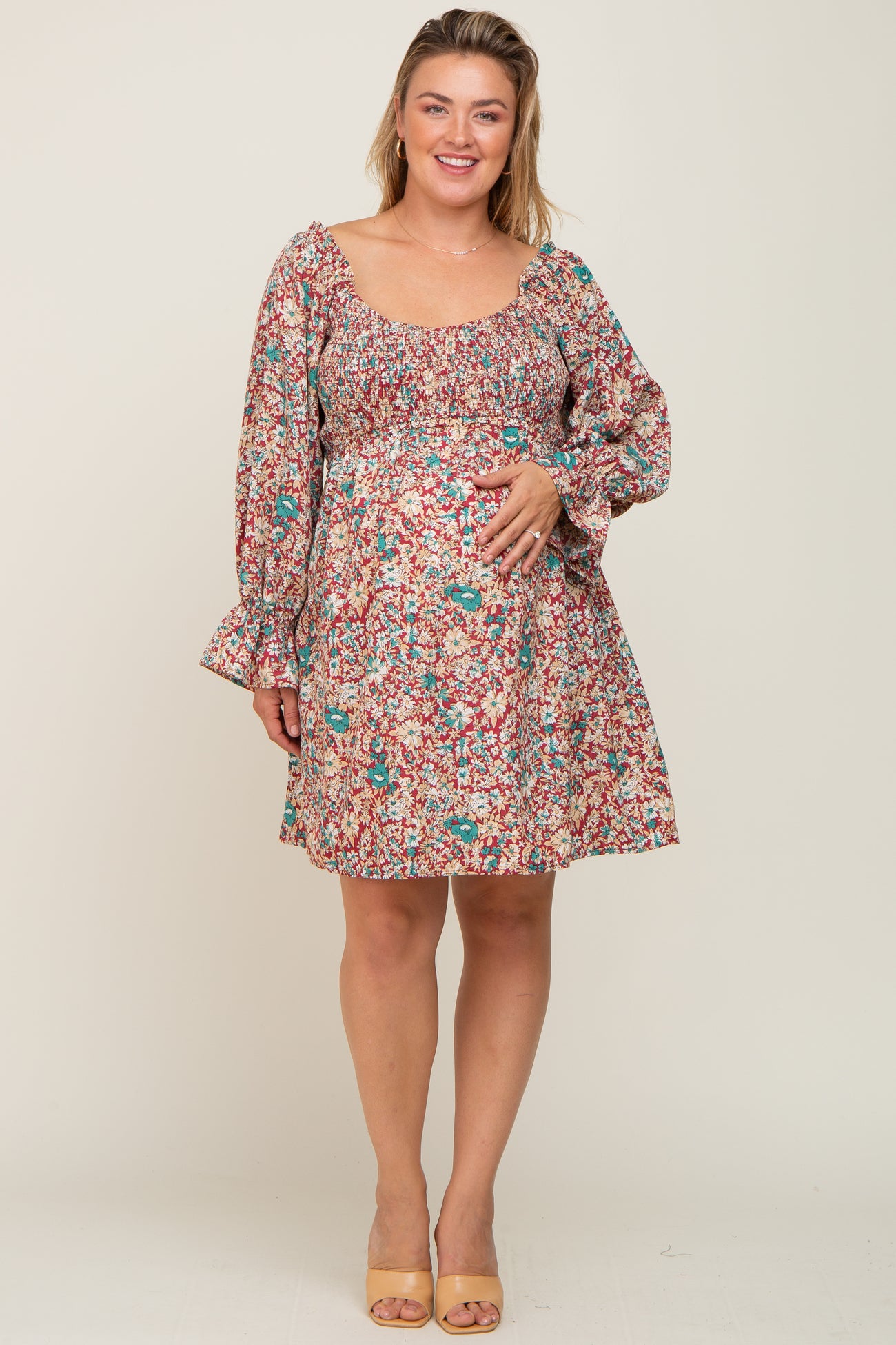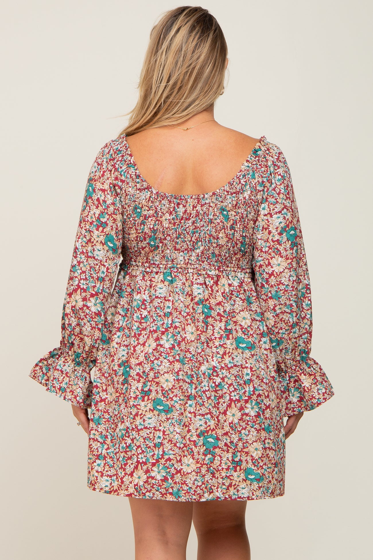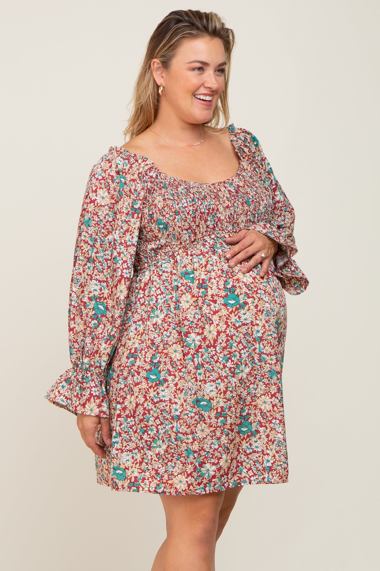 Burgundy Floral Smocked Ruffle Accent Maternity Plus Dress