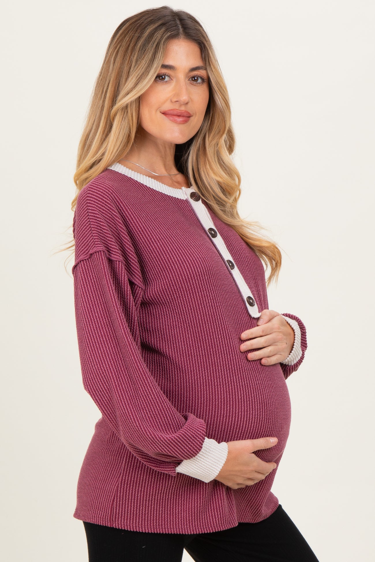 Burgundy Long Sleeve Contrast Button Detail Rib Maternity Top