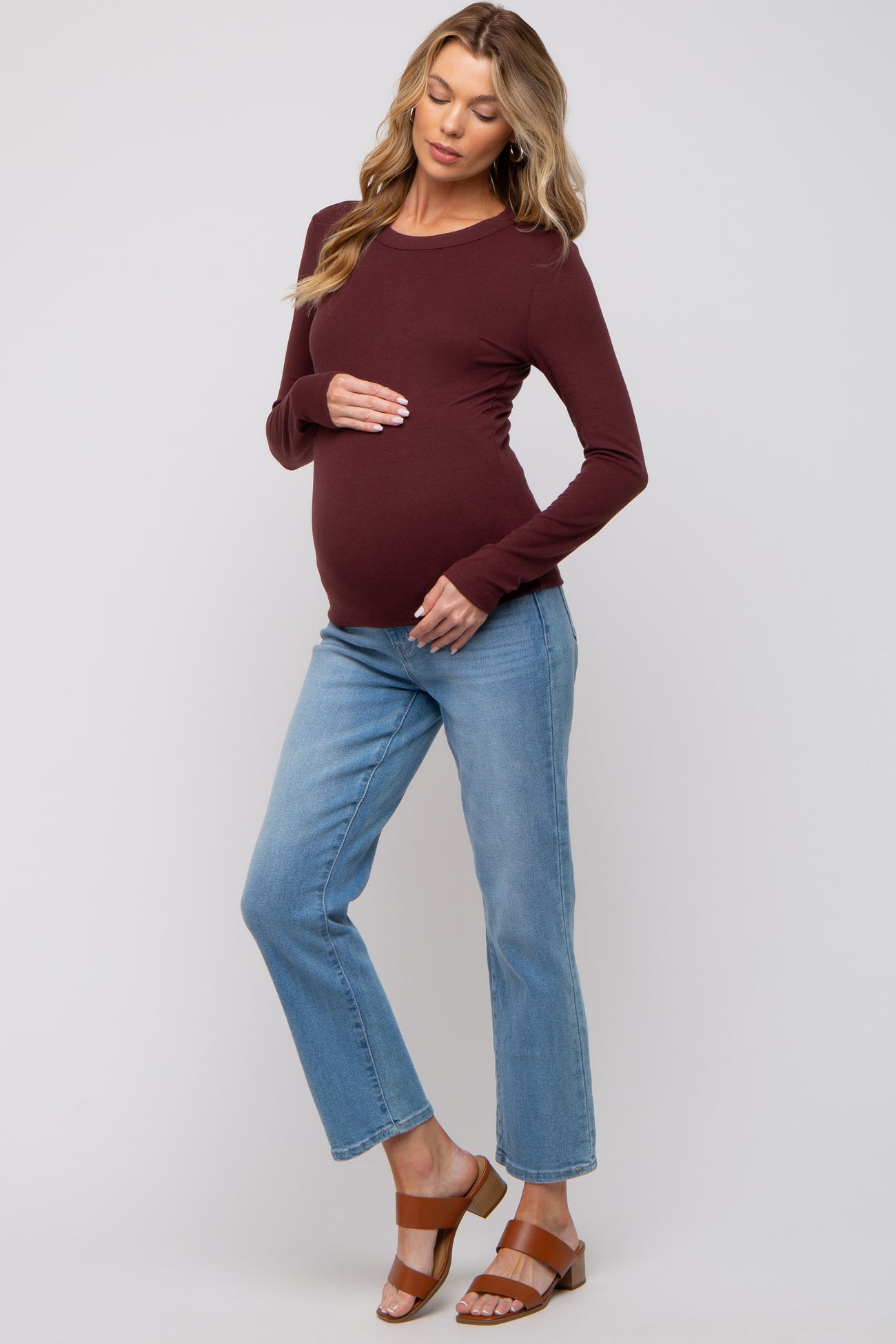 A solid hued maternity top featuring long sleeves and a rounded neckline.