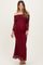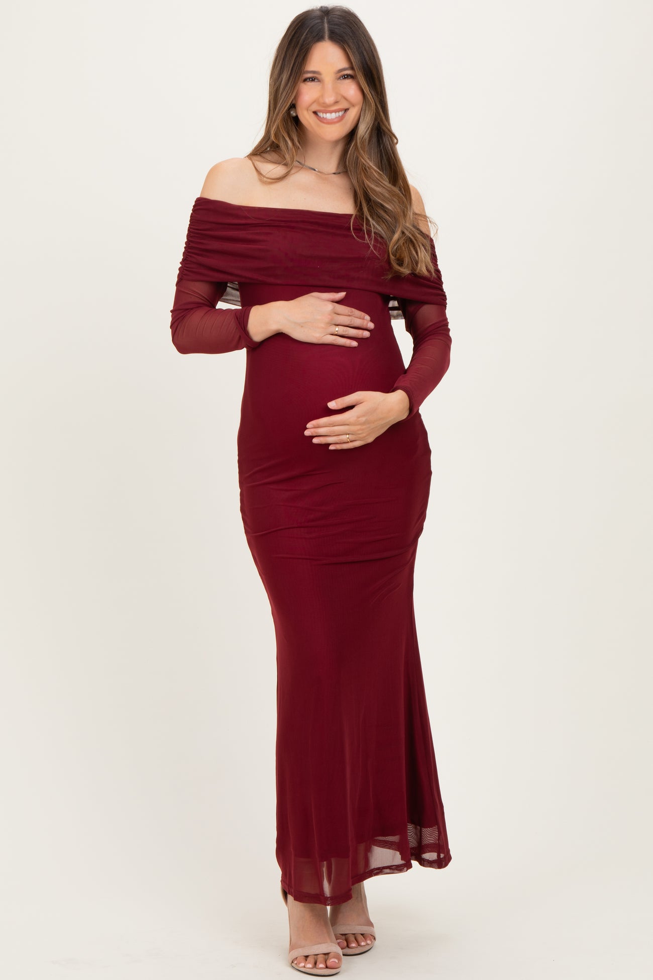 Burgundy Mesh Off Shoulder Long Sleeve Maternity Maxi Dress