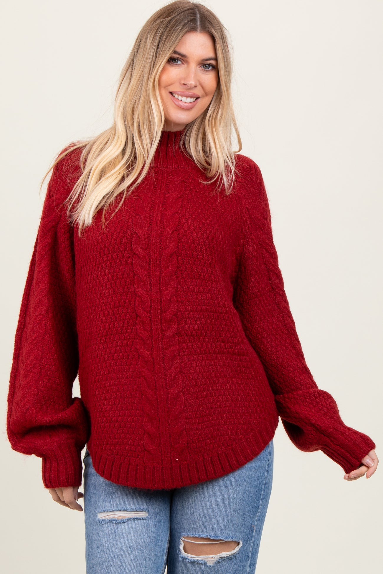 Burgundy Mixed Chunky Cable Knit Mock Neck Sweater