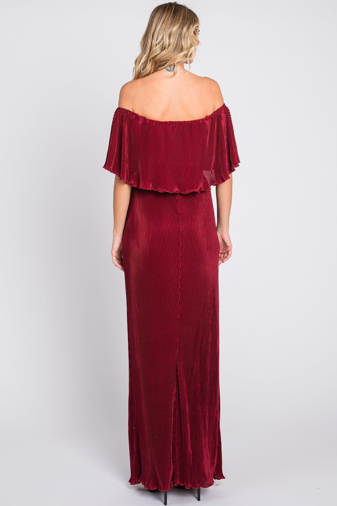 Burgundy Pleated Ruffle Off Shoulder Maxi Dress