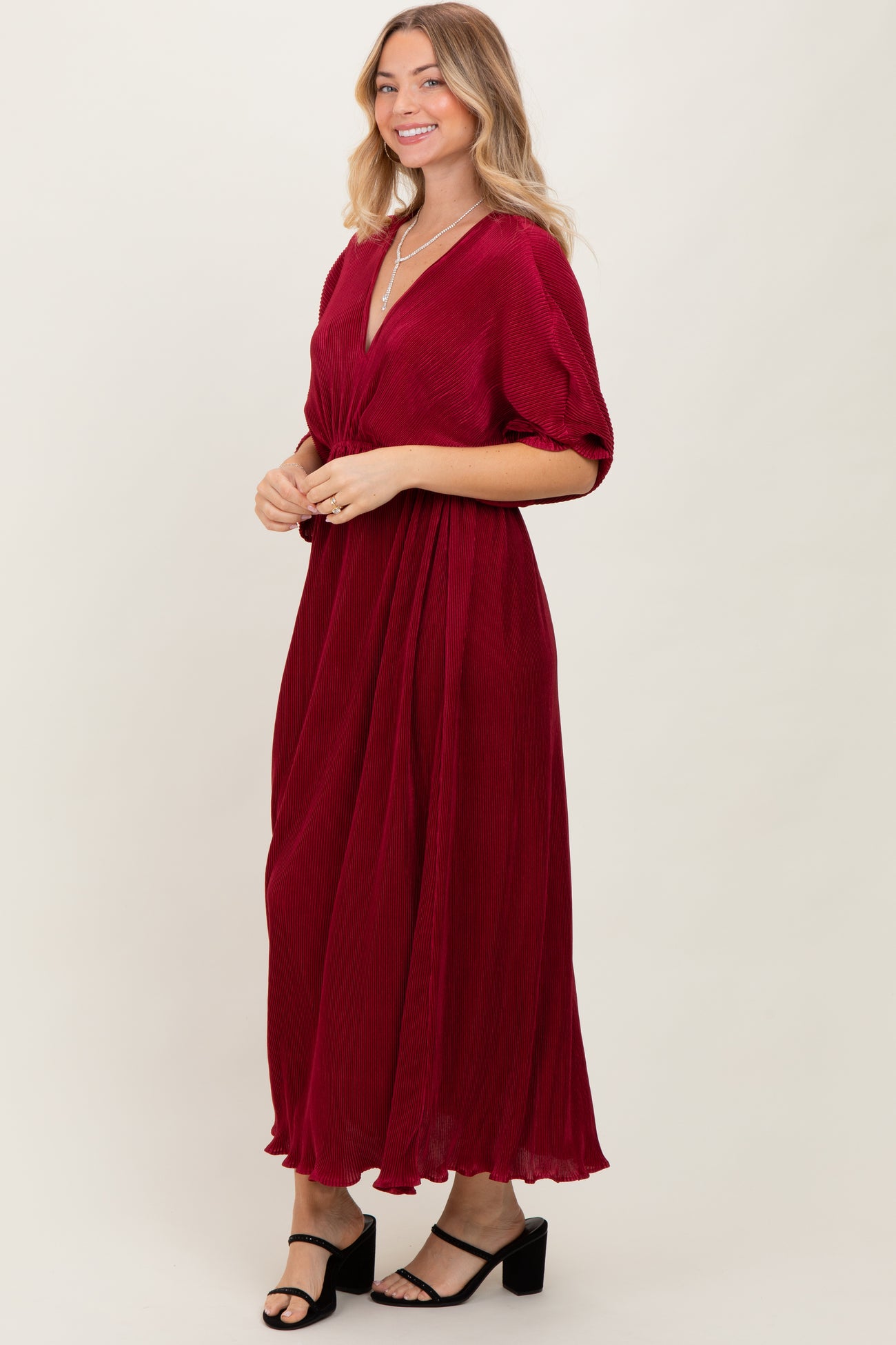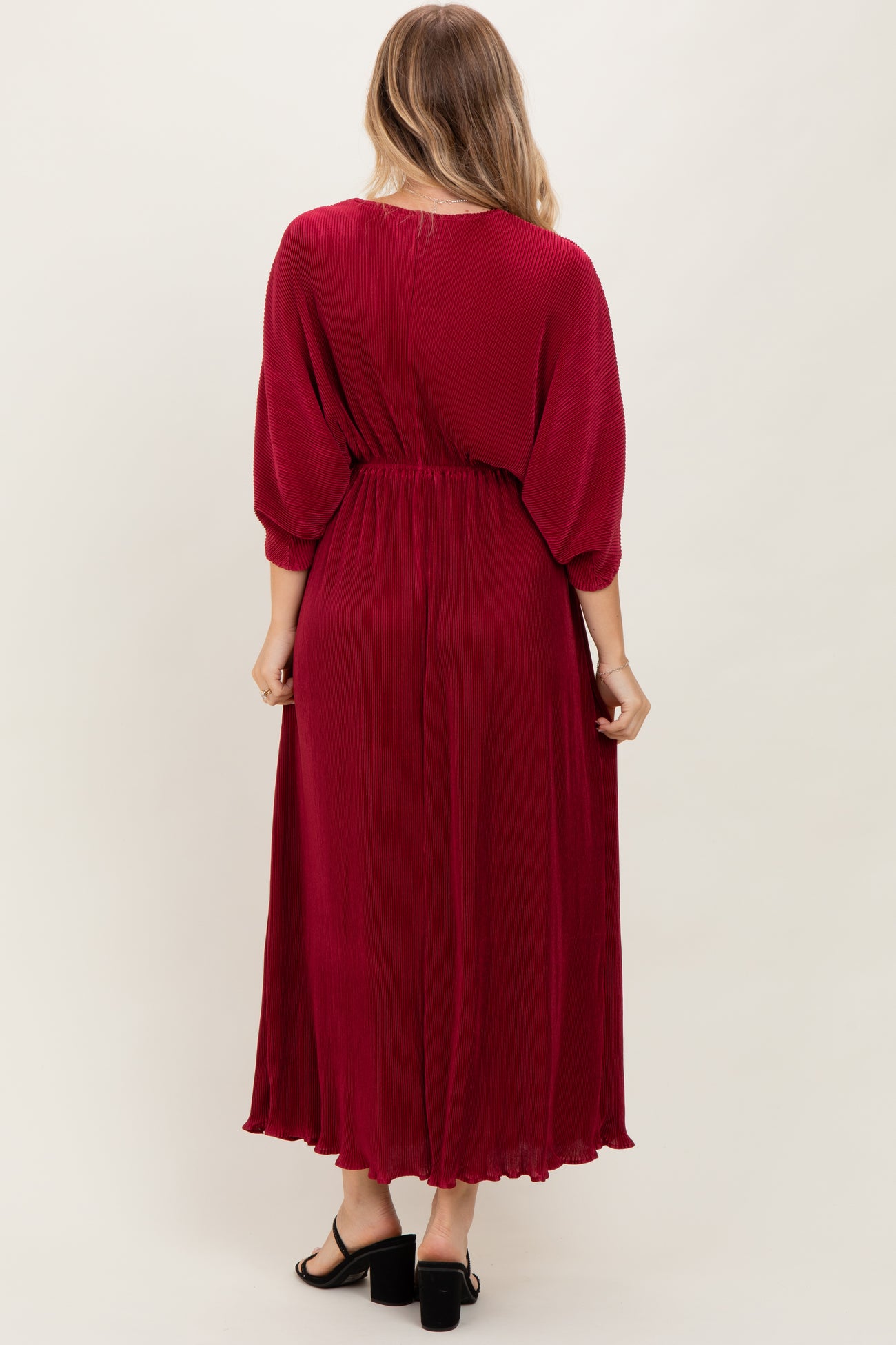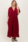 Burgundy Pleated Satin Dolman Sleeve Maxi Dress