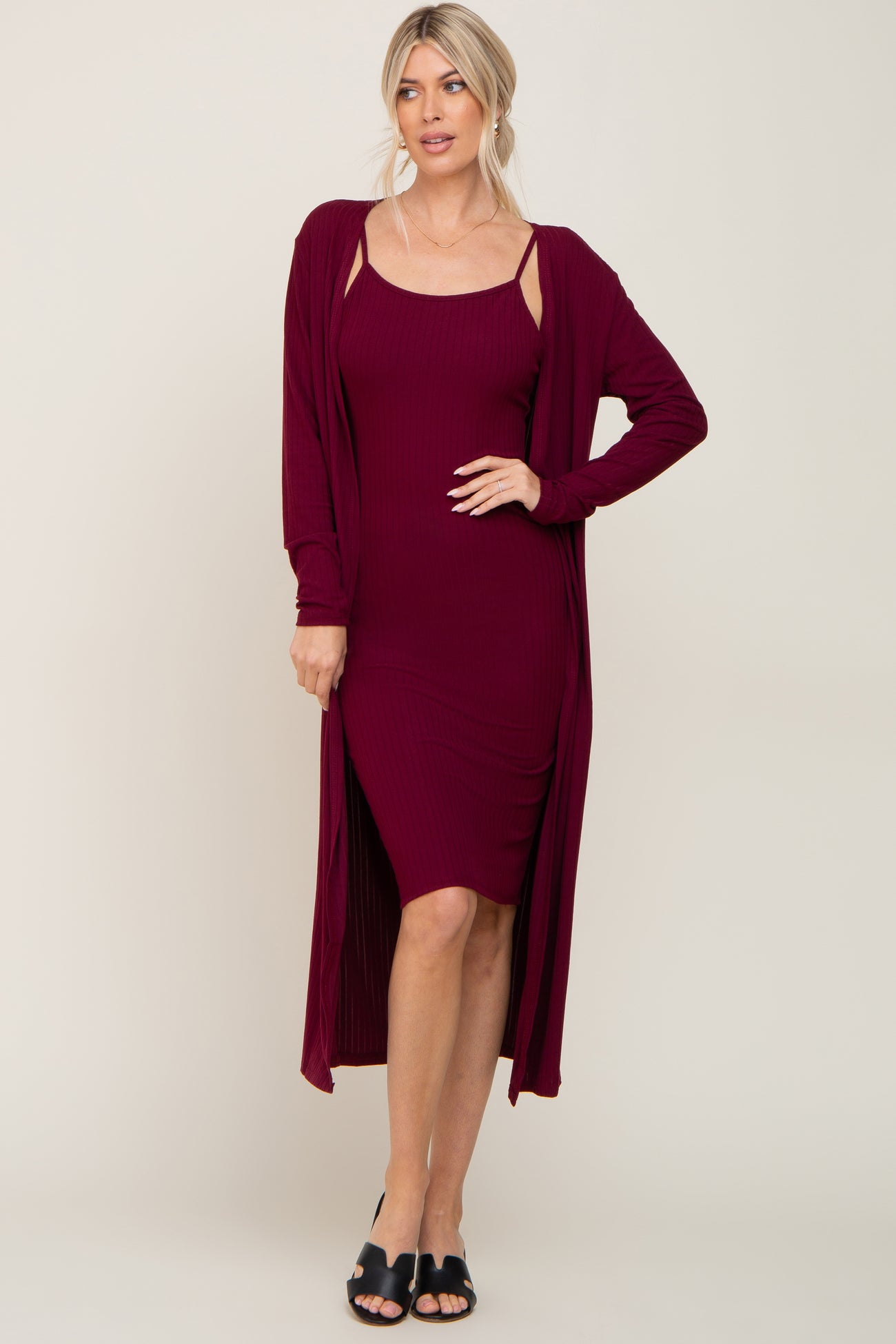 A solid ribbed cardigan and dress two piece set. Dress straps are not adjustable.