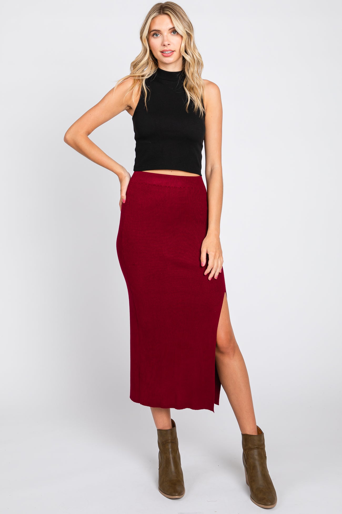 Burgundy Ribbed Knit Slit Maternity Midi Skirt