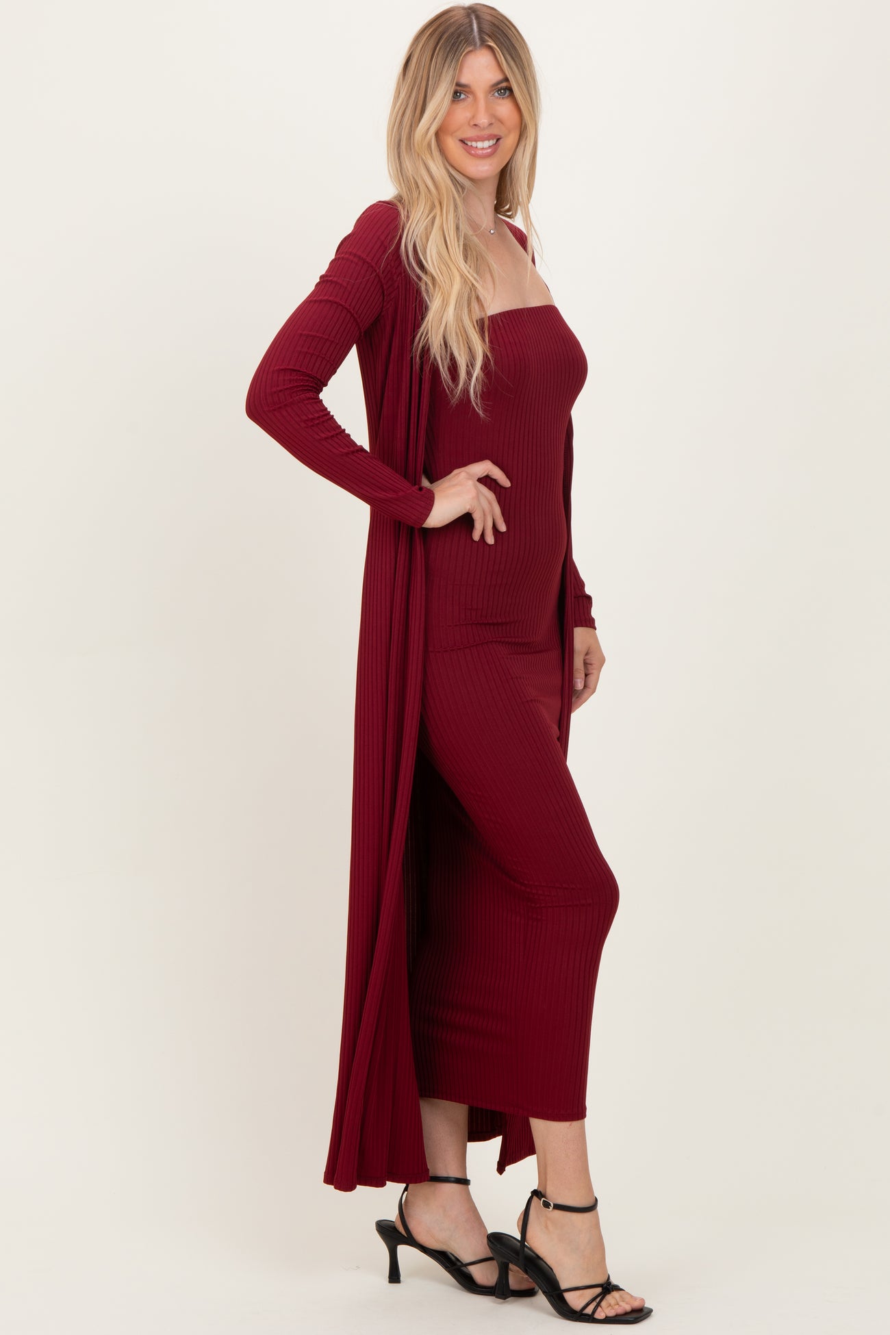 Burgundy Ribbed Sleeveless Dress Cardigan Set