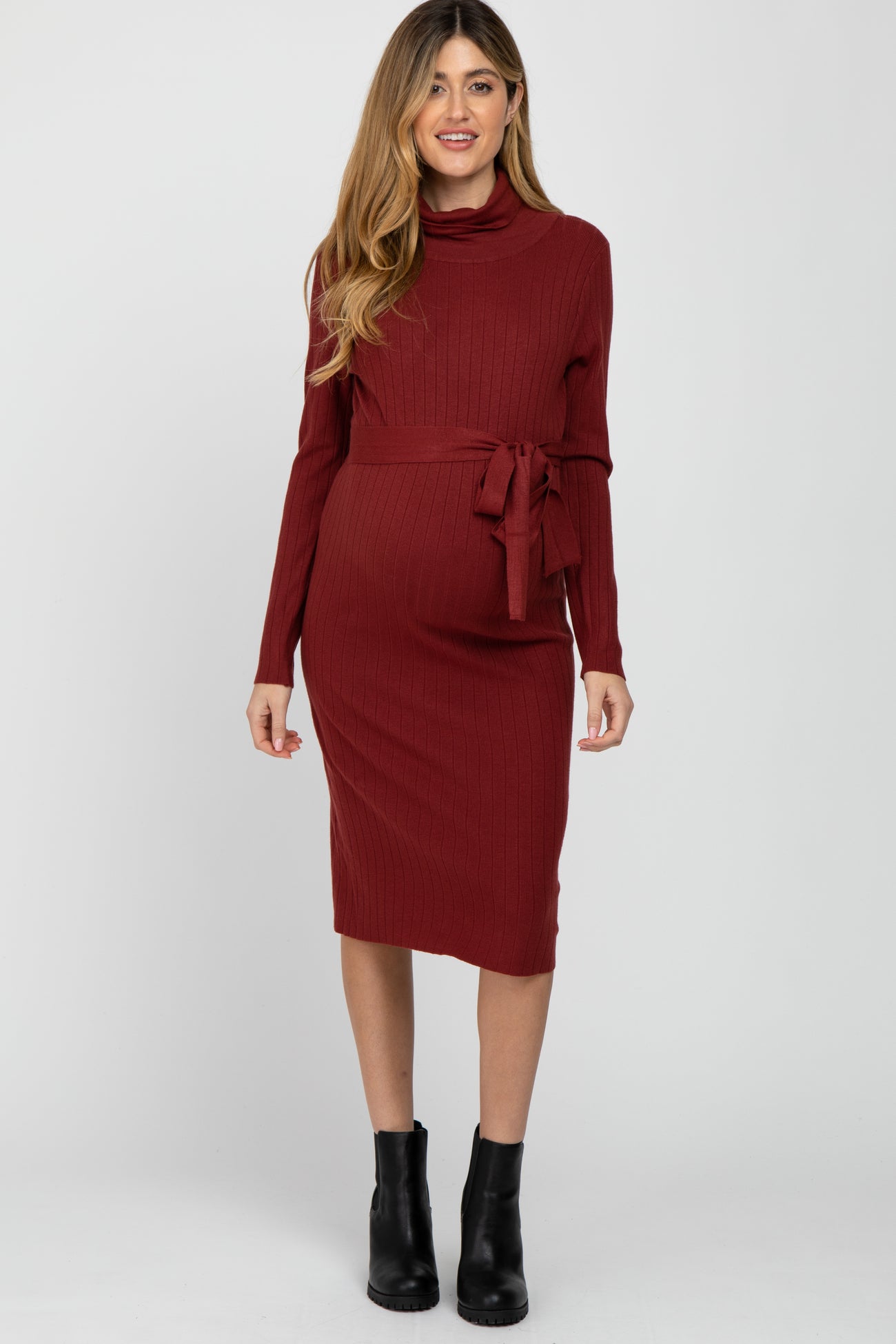 A solid, ribbed maternity sweater dress with long sleeves, a turtleneck, and a sash wait tie.
