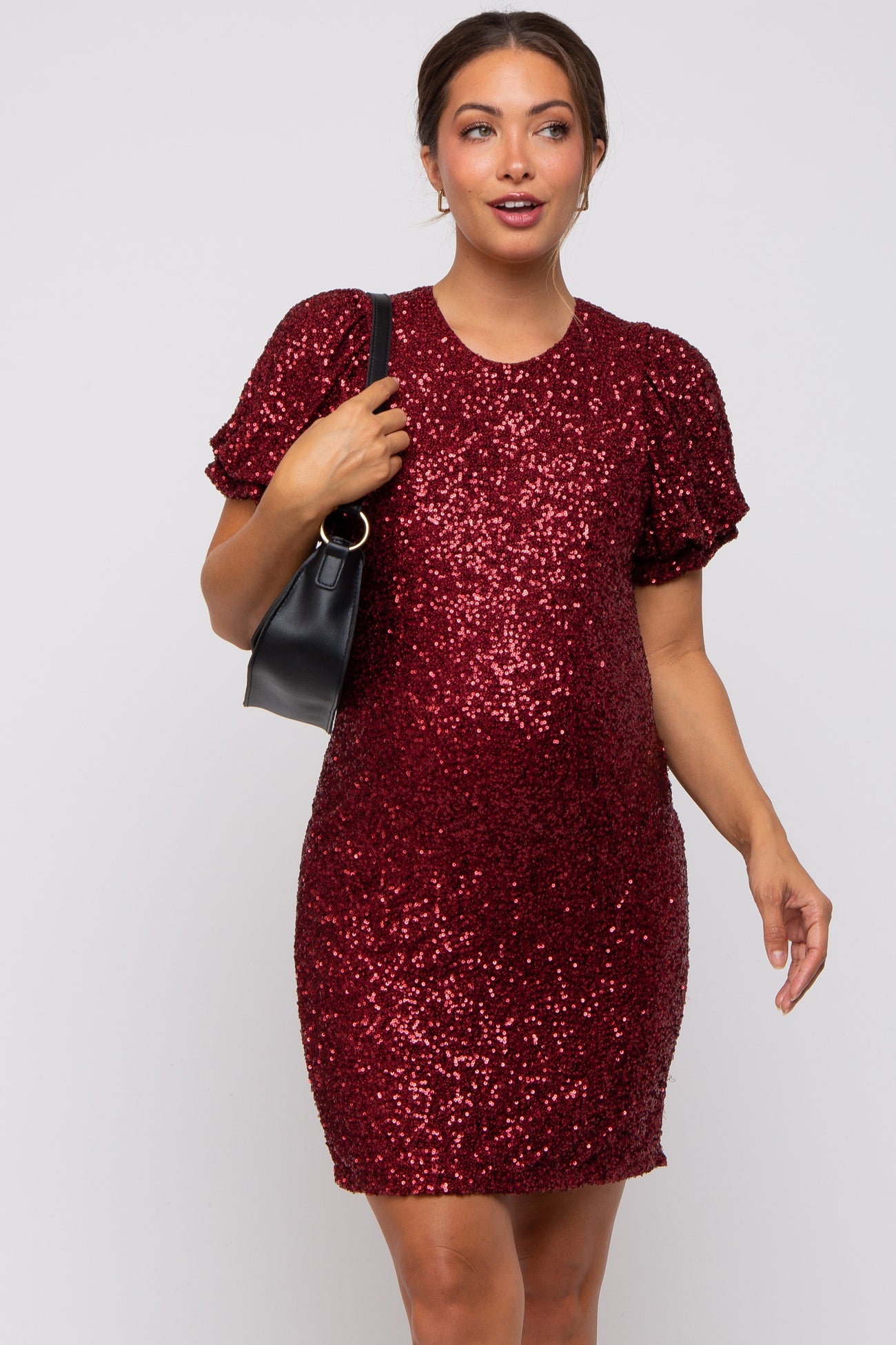 A sequin maternity fitted mini dress with puff sleeves, double lining and hook eye and zip closure in back.