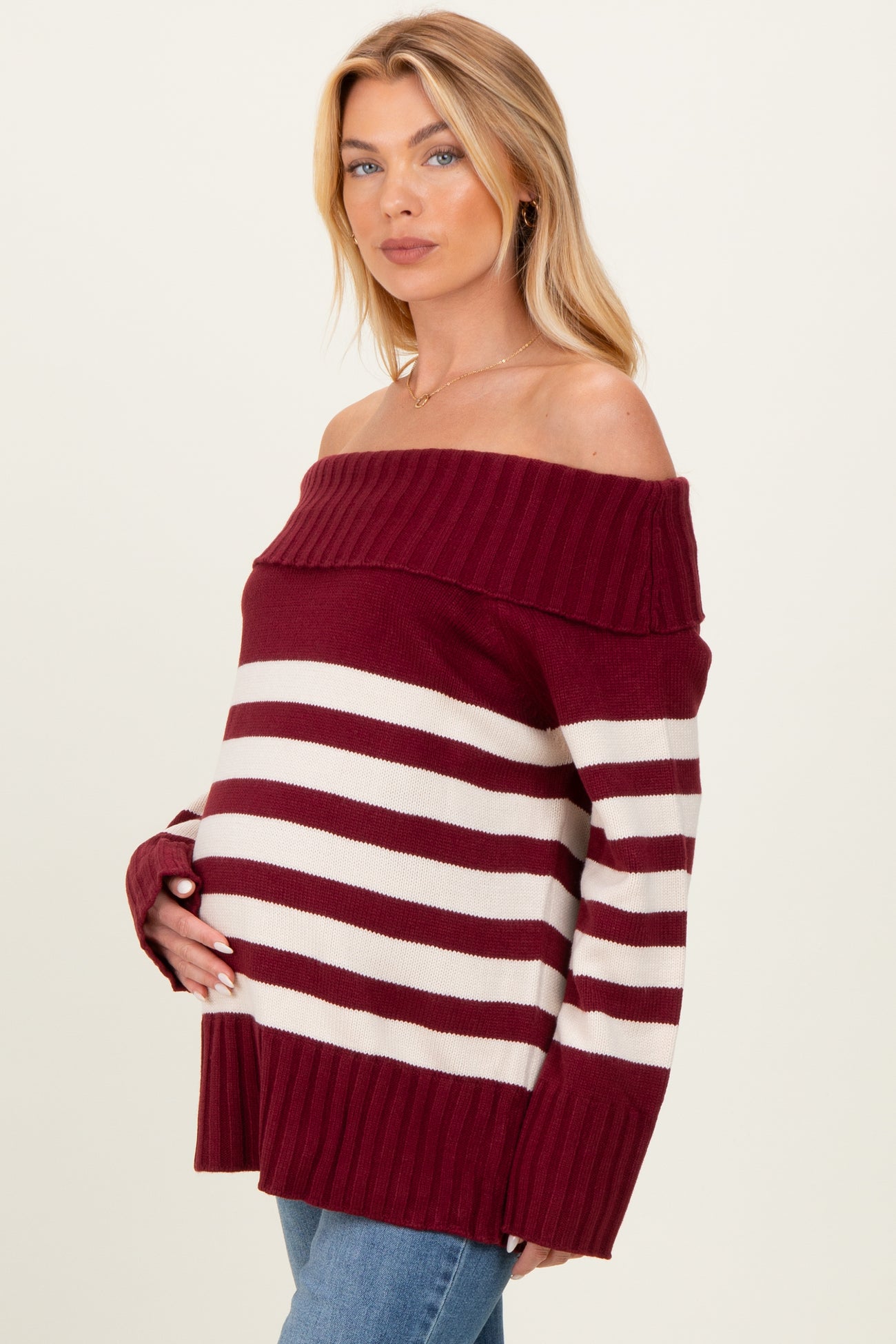 Burgundy Striped Off Shoulder Maternity Sweater