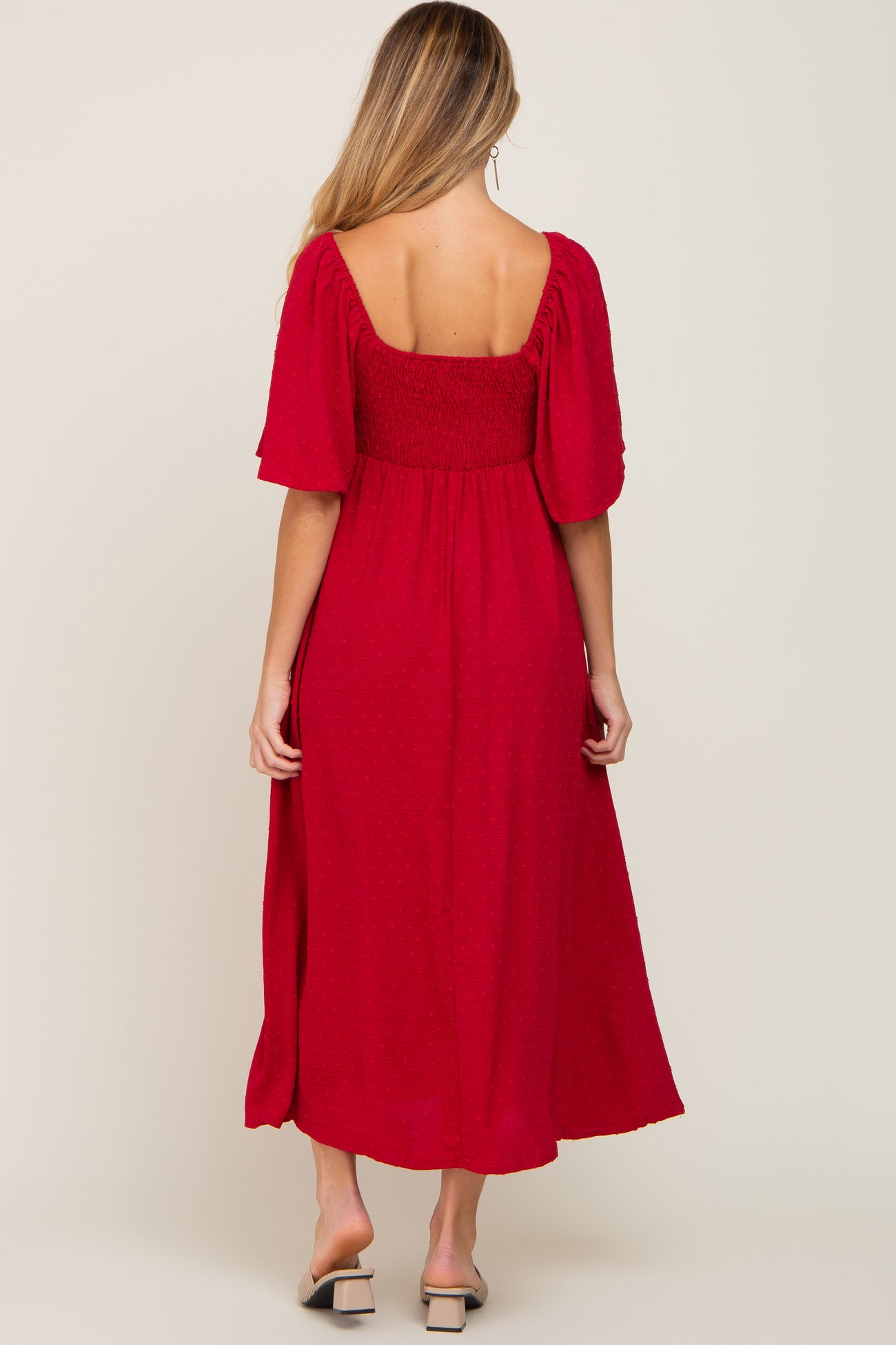 Burgundy Textured Dot Front Tie Ruffle Sleeve Maternity Midi Dress