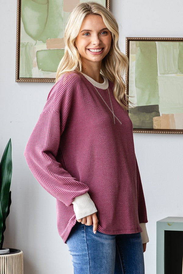 Burgundy Textured Rib Relaxed Fit Pullover Top