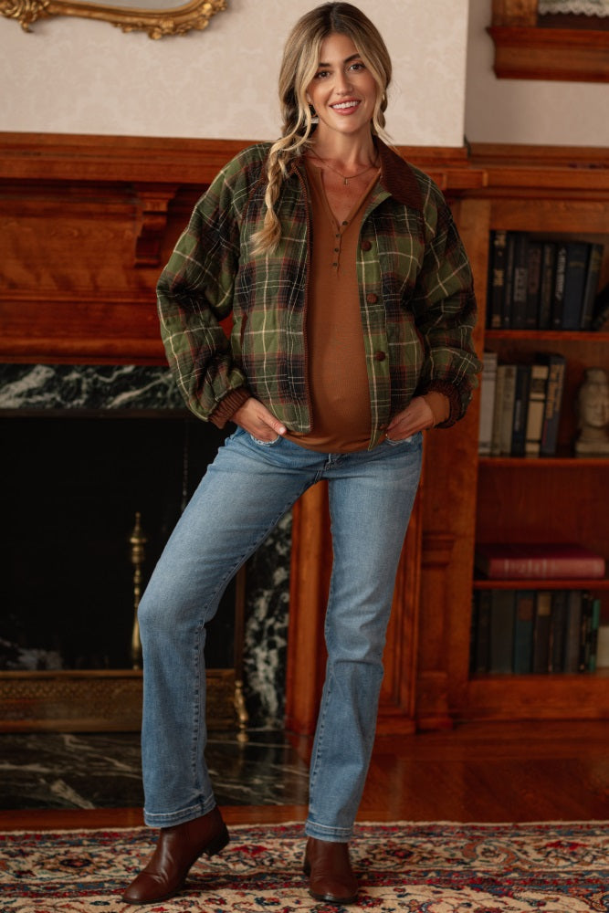 A fitted maternity top featuring front buttons, long sleeves and a v-neckline.