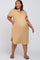 A soft knit maternity plus size midi dress featuring a half button up v-neckline, short, rolled sleeves and a rounded hem with side slits.