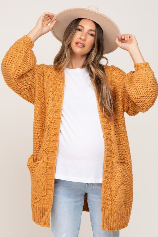 A cable knit maternity cardigan with an open front, long balloon sleeves, and front pockets.