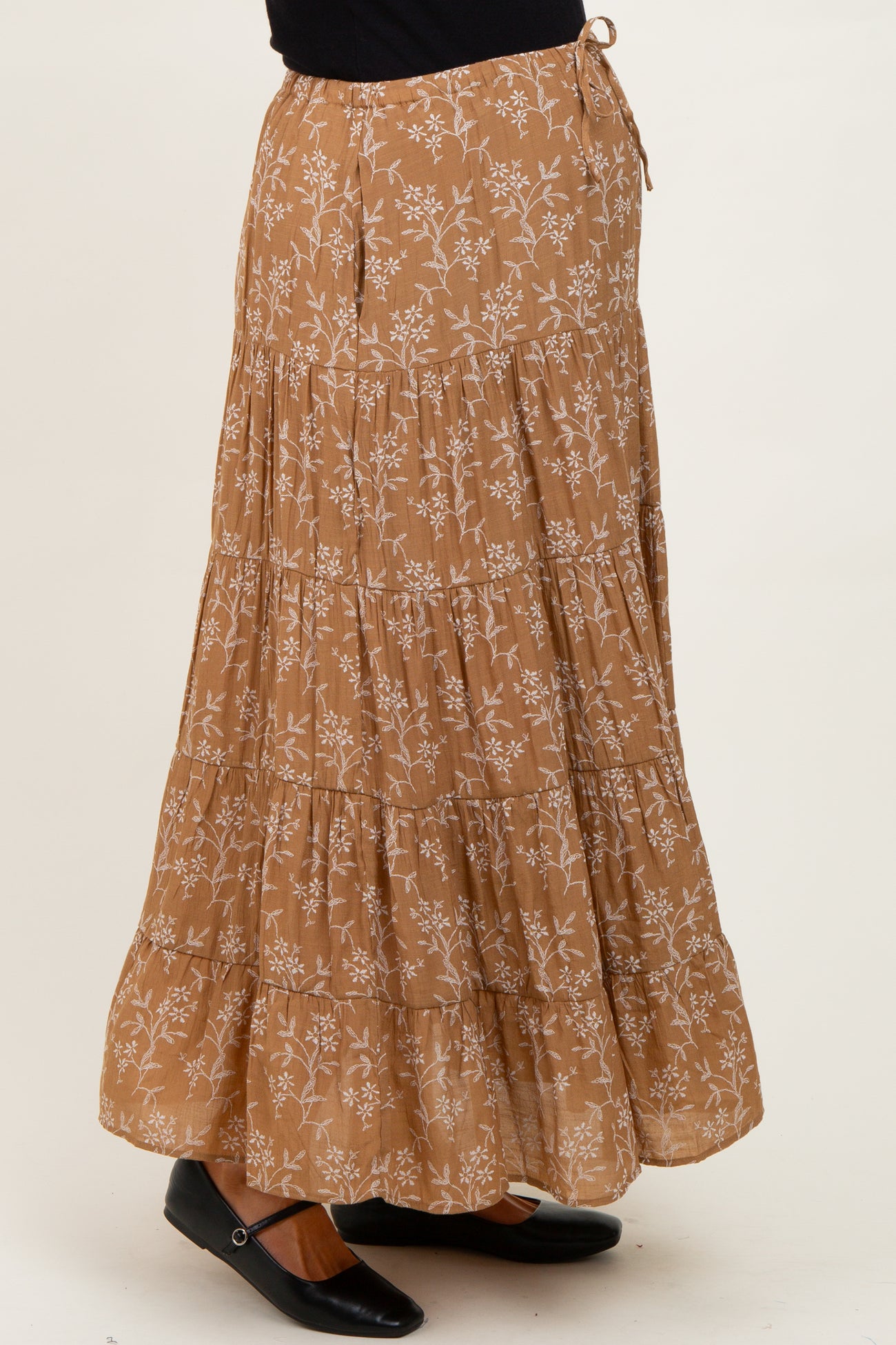 Camel Floral Drawstring Tiered Maternity Maxi Skirt