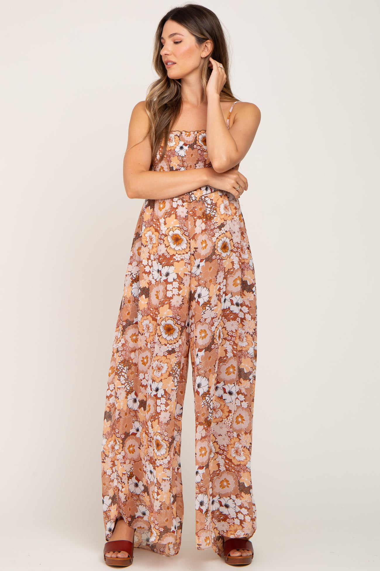 A floral print sleeveless maternity jumpsuit featuring adjustable cami straps, a smocked top, side pockets and wide legs.