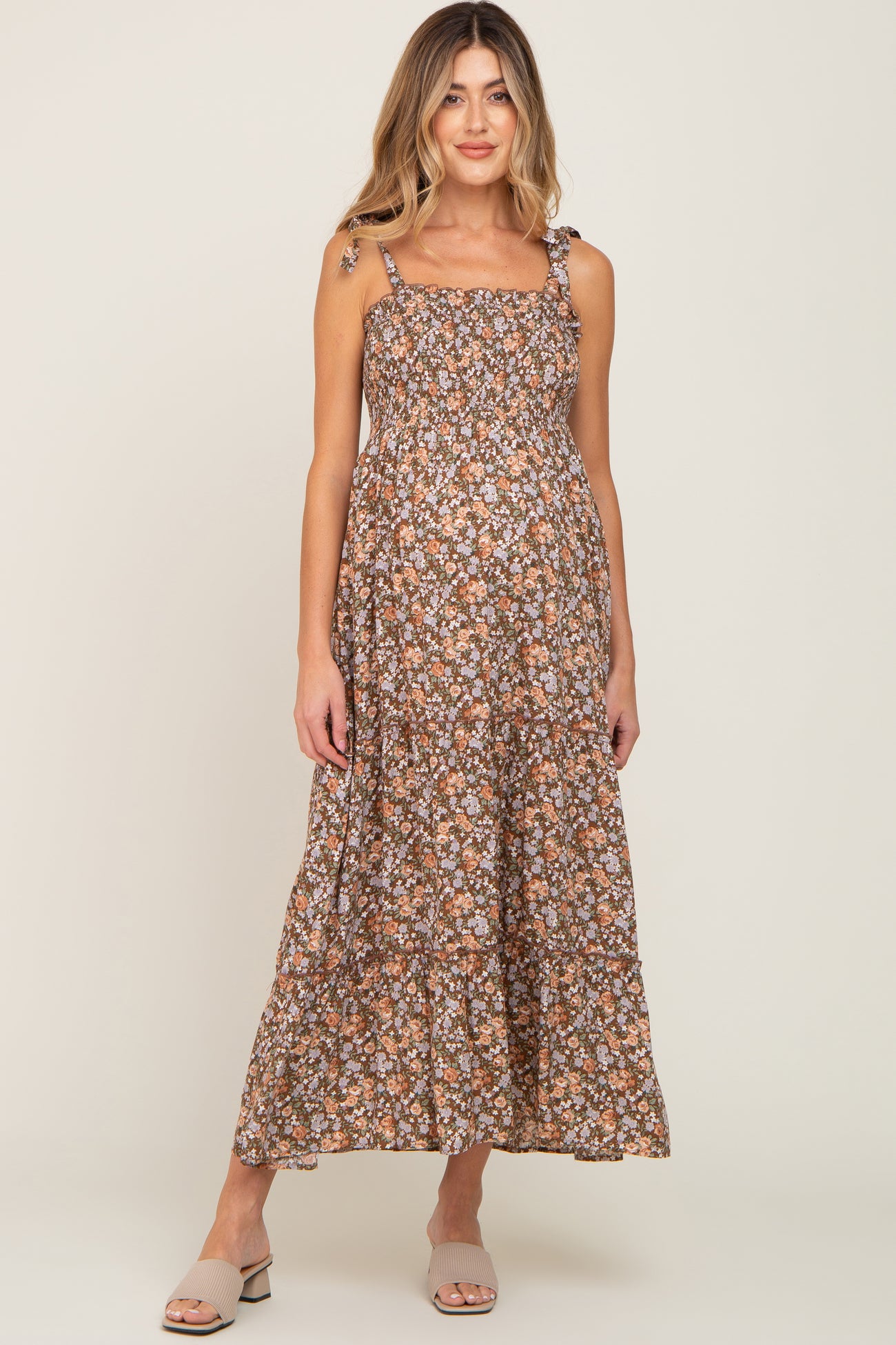 A floral sleeveless maternity maxi dress featuring self-tie shoulder straps, a smocked top, a tiered skirt, side pockets and a square neckline.