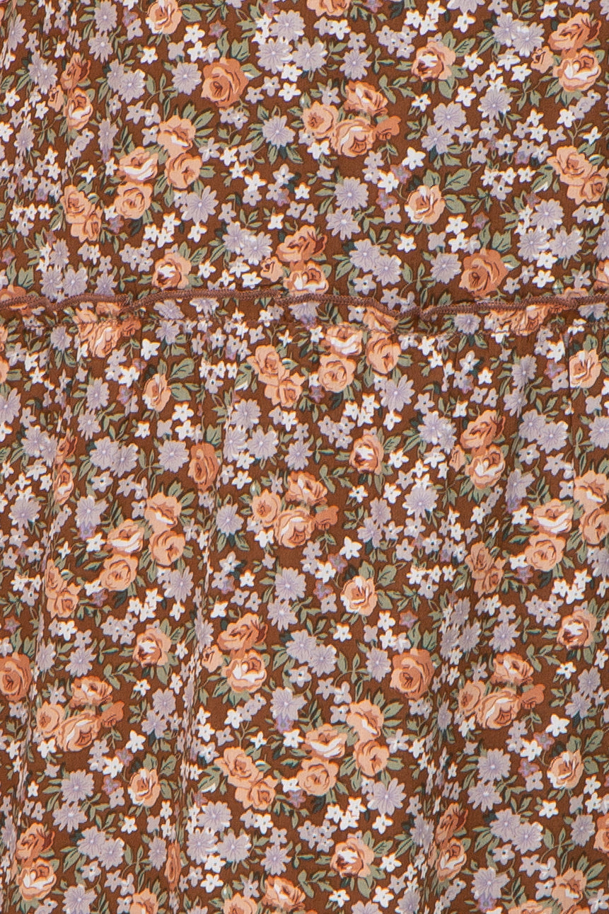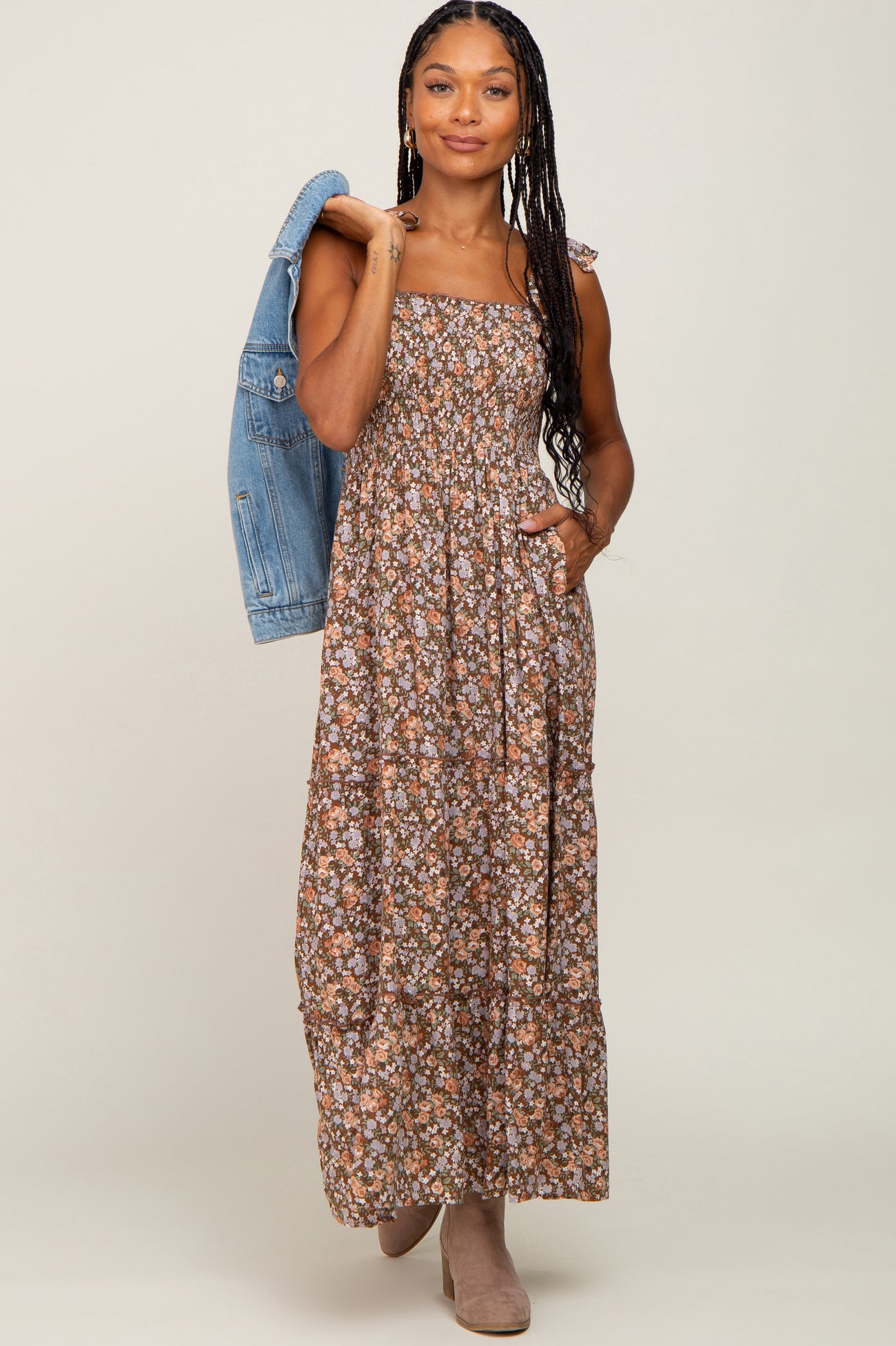 A floral sleeveless maxi dress featuring self-tie shoulder straps, a smocked top, a tiered skirt, side pockets and a square neckline.