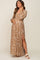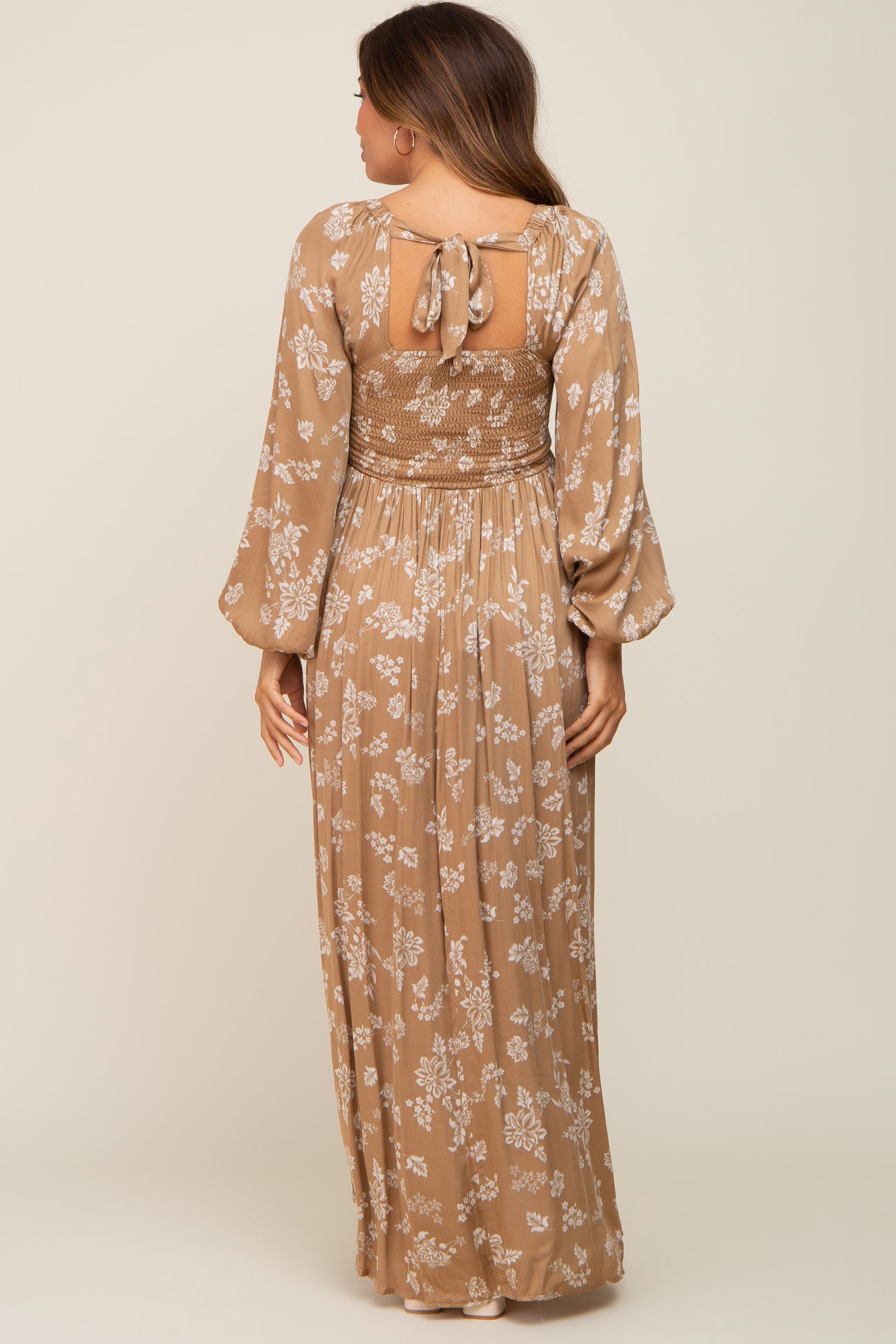 Details A floral maternity maxi dress. Features a smocked top, a squared neckline, long sleeves, a back tie, and a side slit. Content + Care