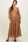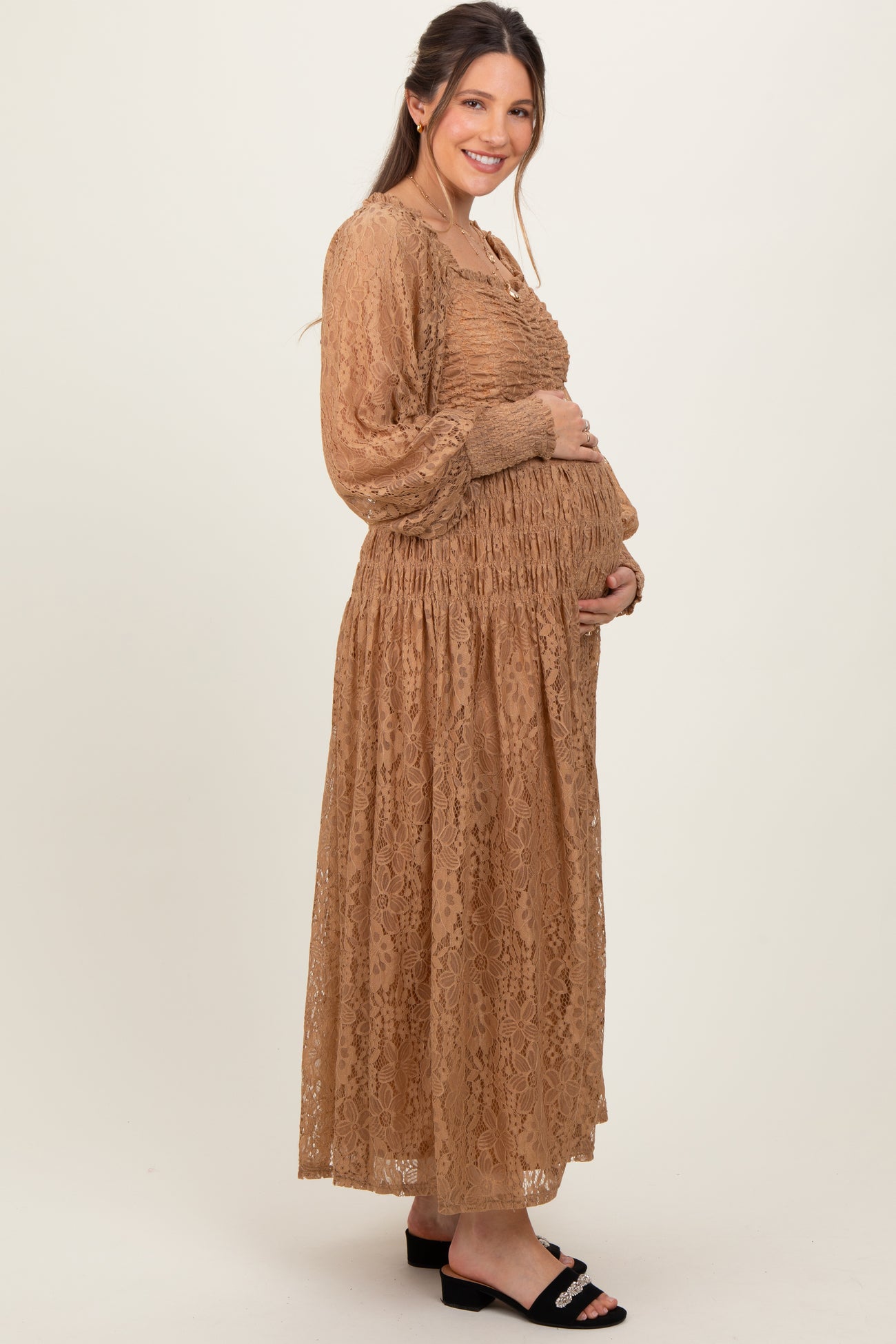 Camel Lace Smocked Bubble Sleeve Maternity Maxi Dress