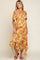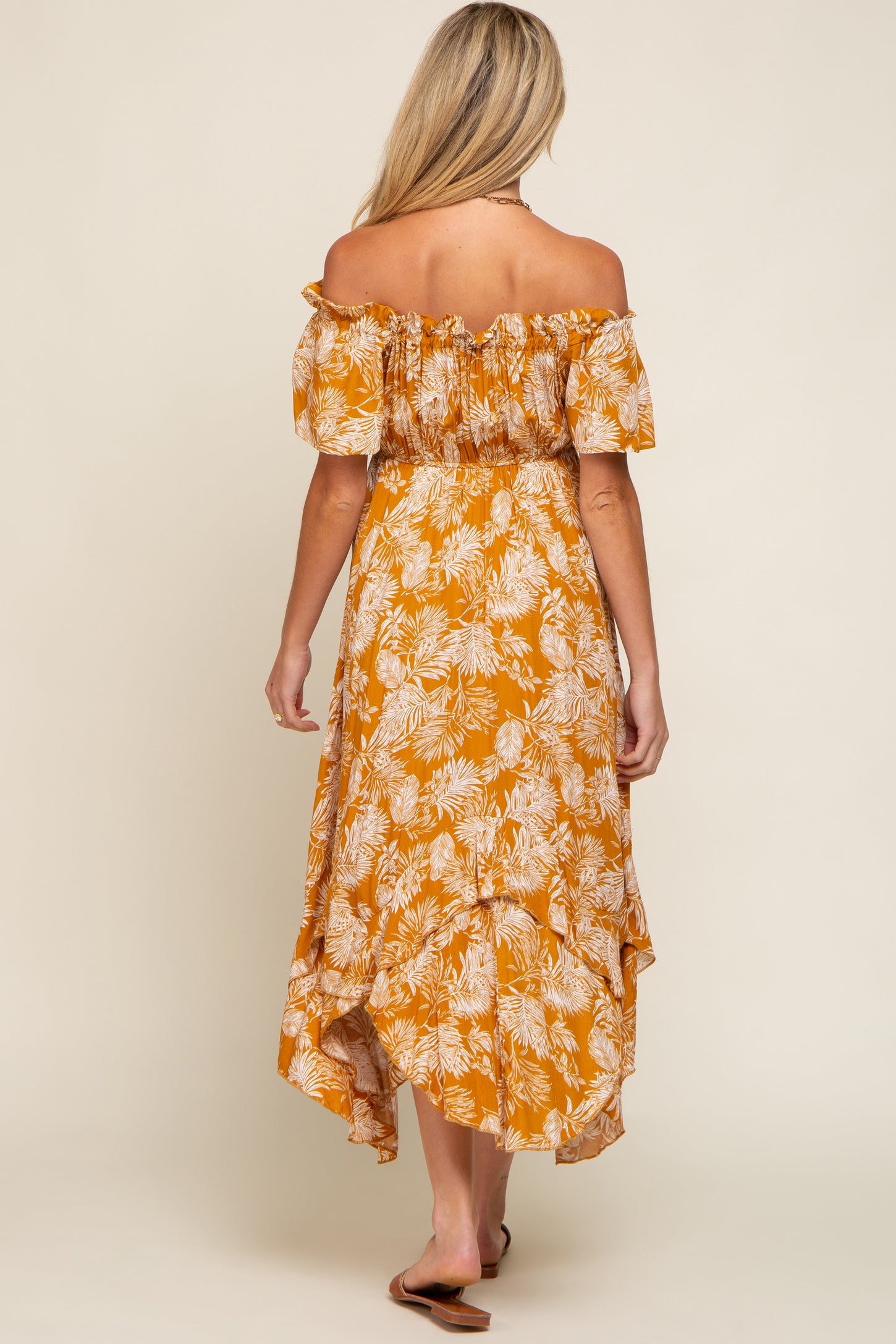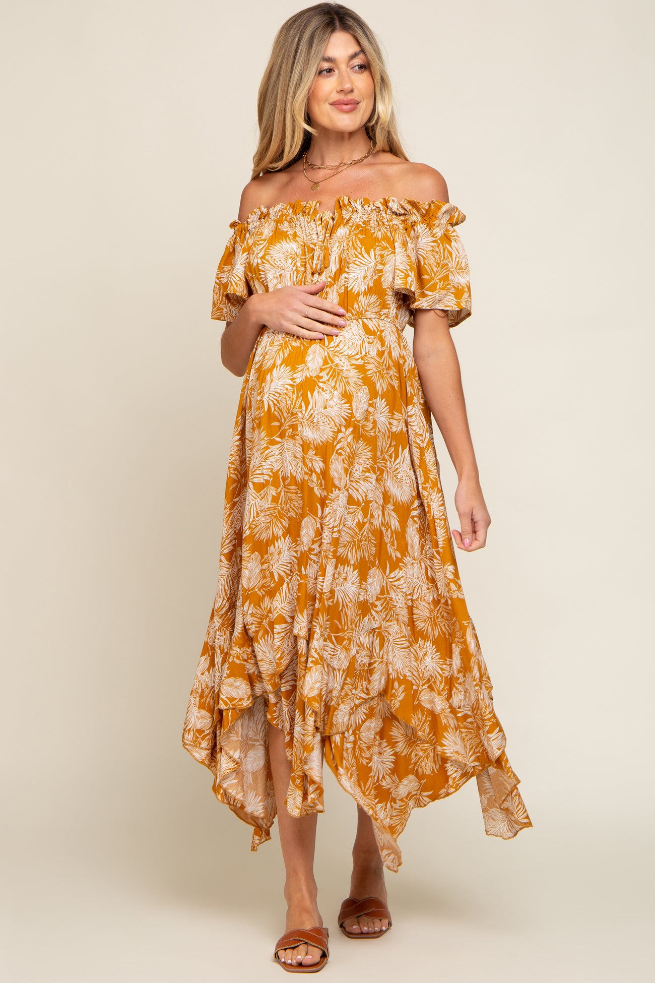 Camel Leaf Print Off Shoulder Handkerchief Maternity Midi Dress