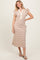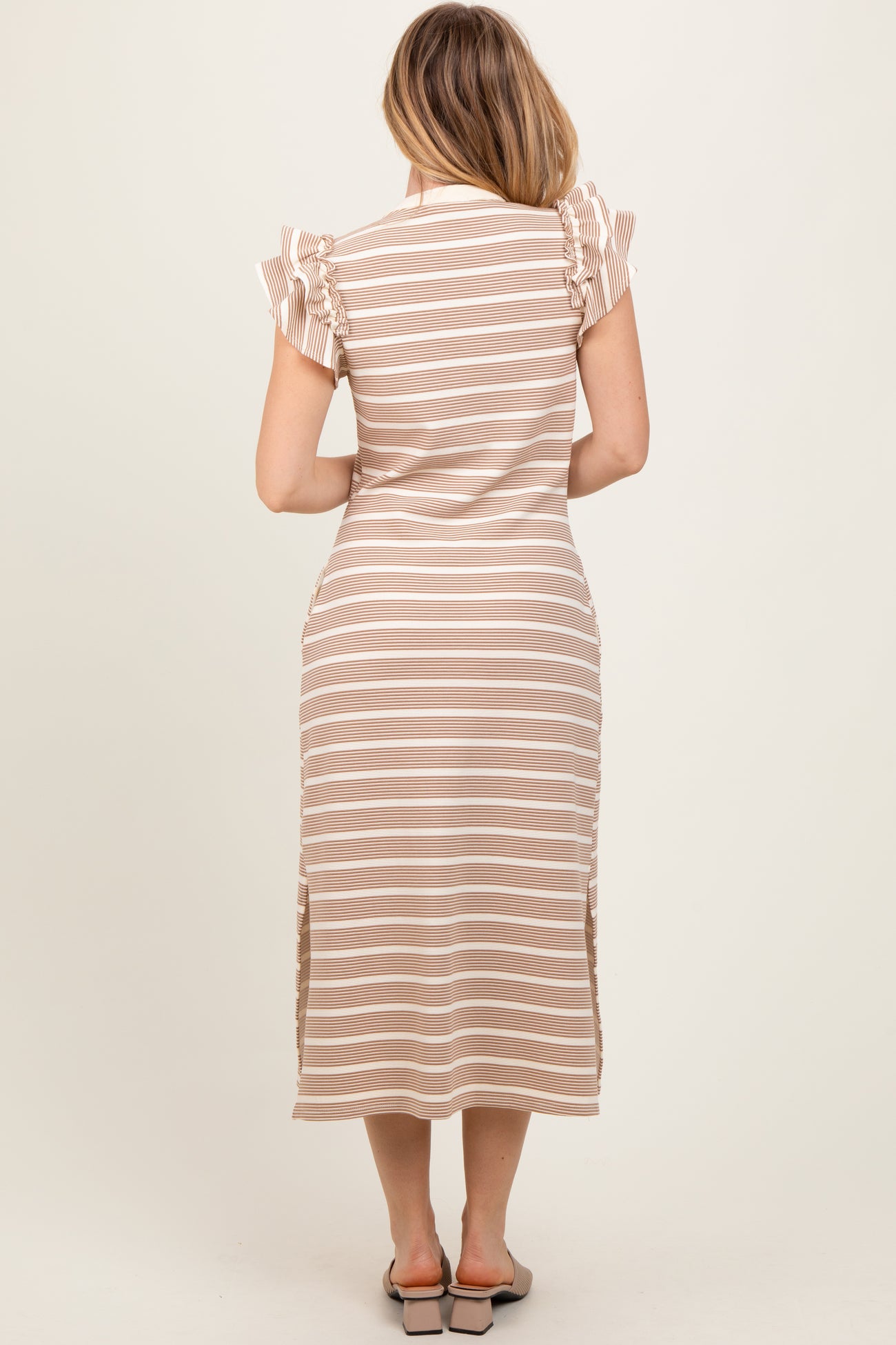Camel Multi-Striped Button Up Ruffle Sleeve Midi Dress