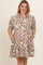 A printed maternity plus dress featuring front buttons, short puff sleeves, top smocking, a tiered body, side pockets and a collared neckline.
