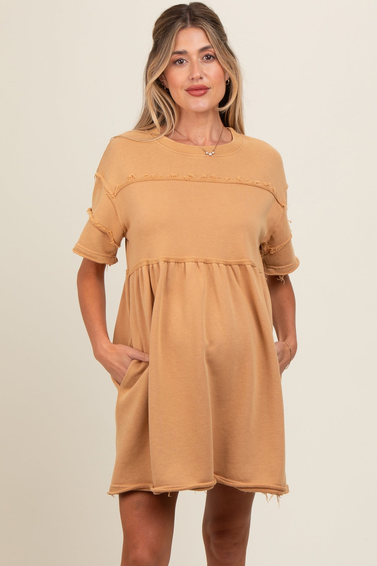 Camel Raw Hem Maternity Short Sleeve Dress