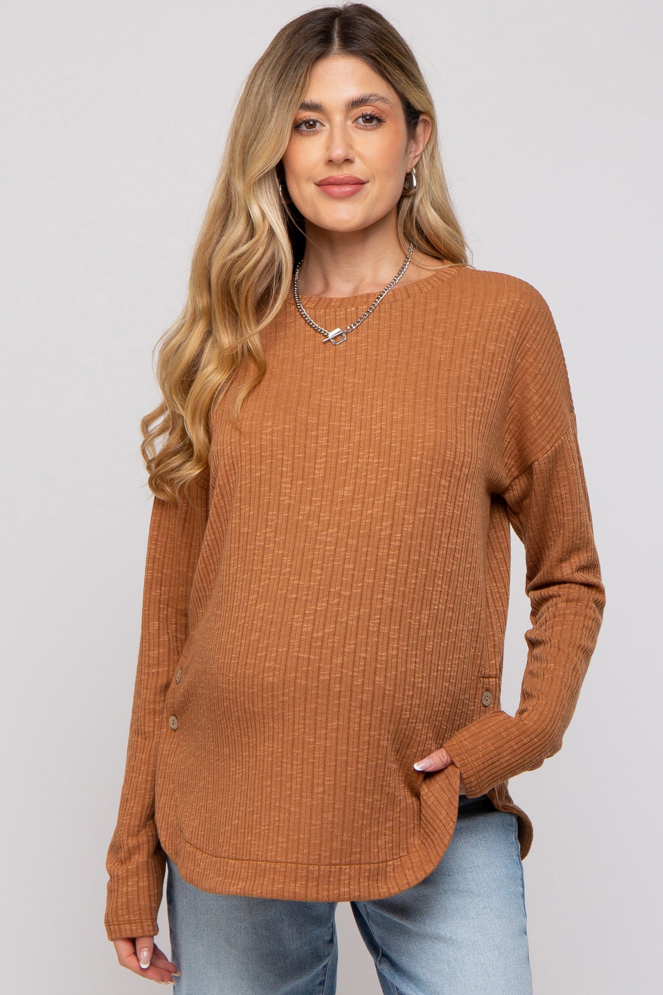 A ribbed knit maternity top featuring a rounded neckline, long sleeves and a round hem with button trim.