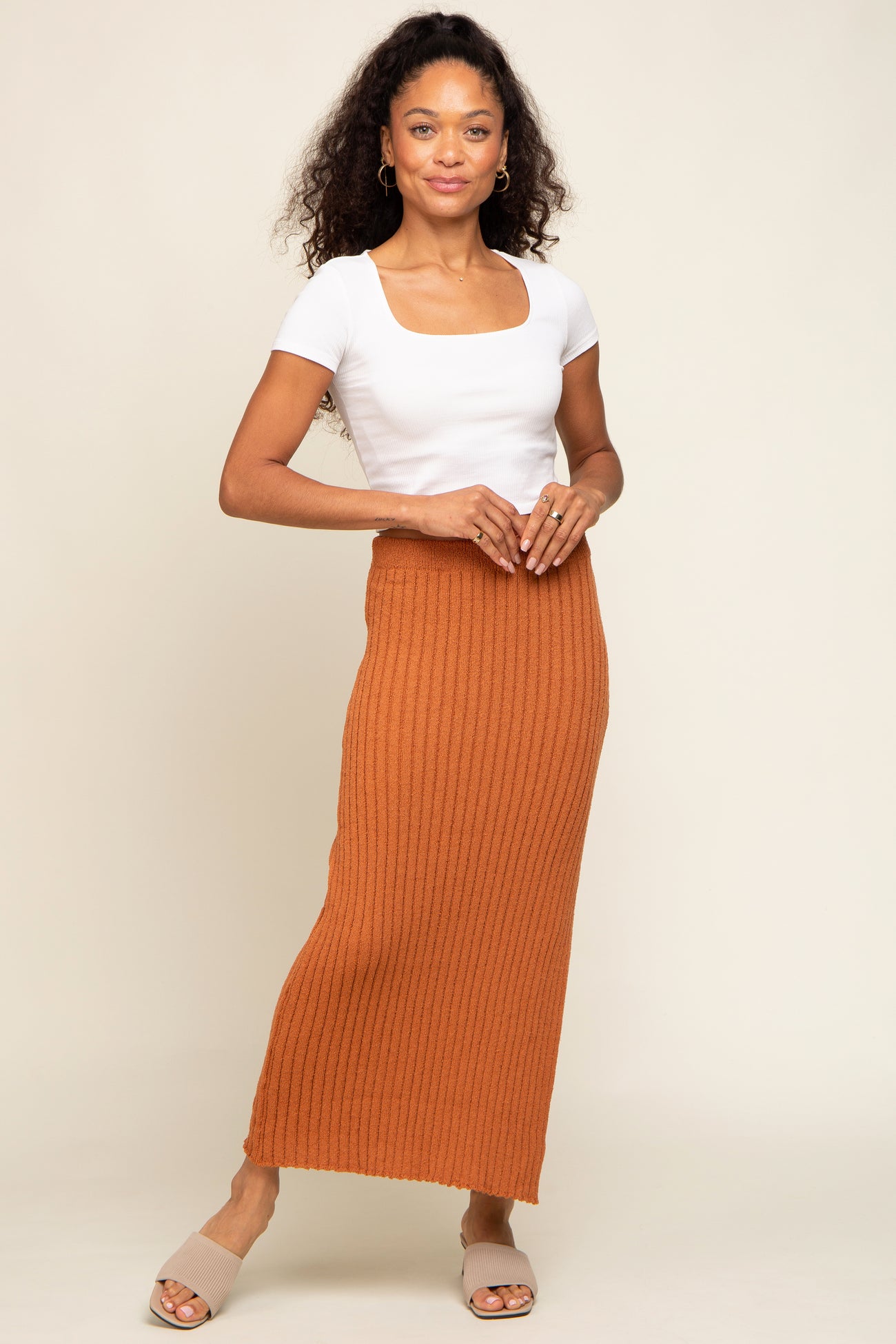 Camel Ribbed Side Slit Sweater Midi Skirt