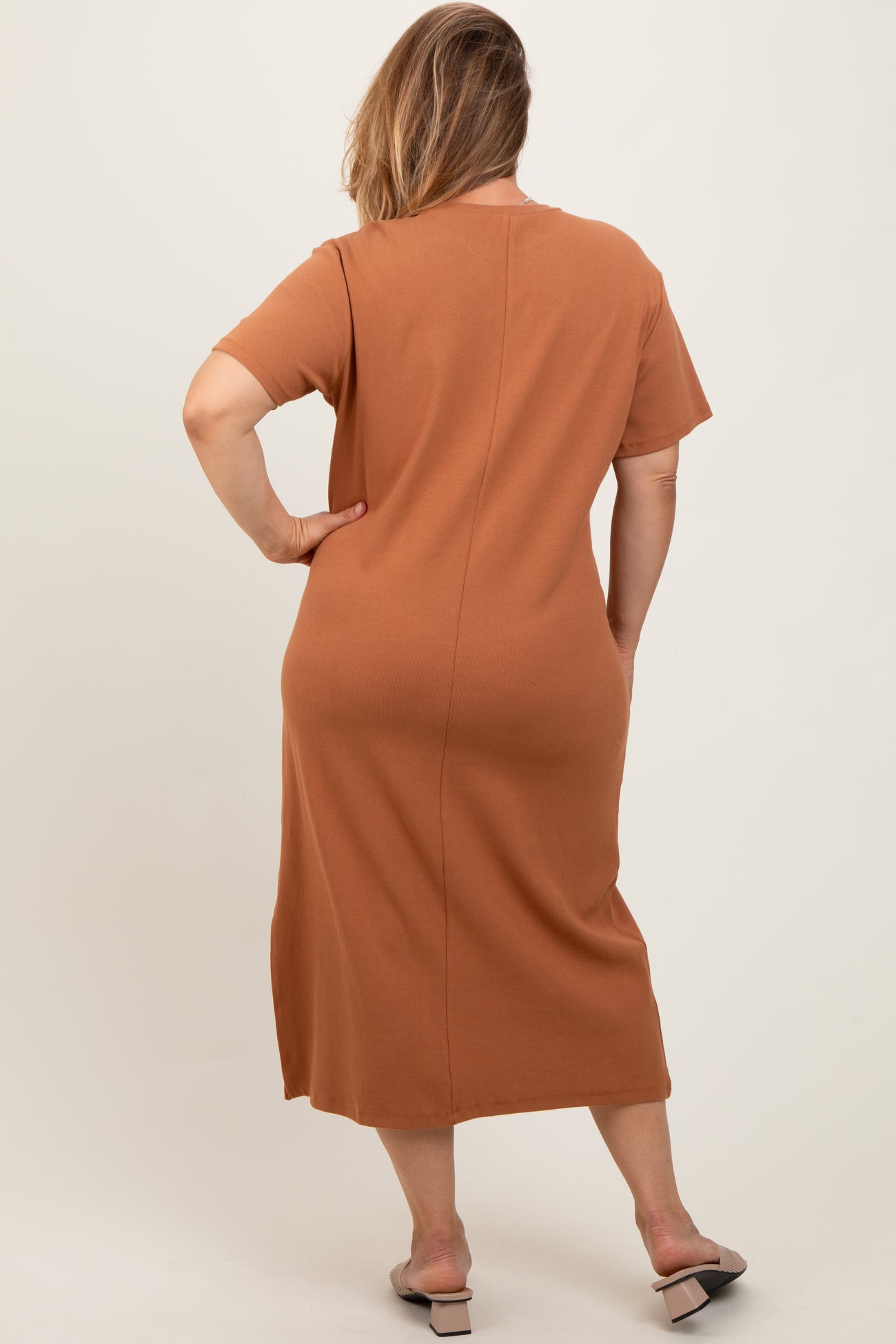 Camel Short Sleeve Side Slit Maternity Plus T-Shirt Midi Dress