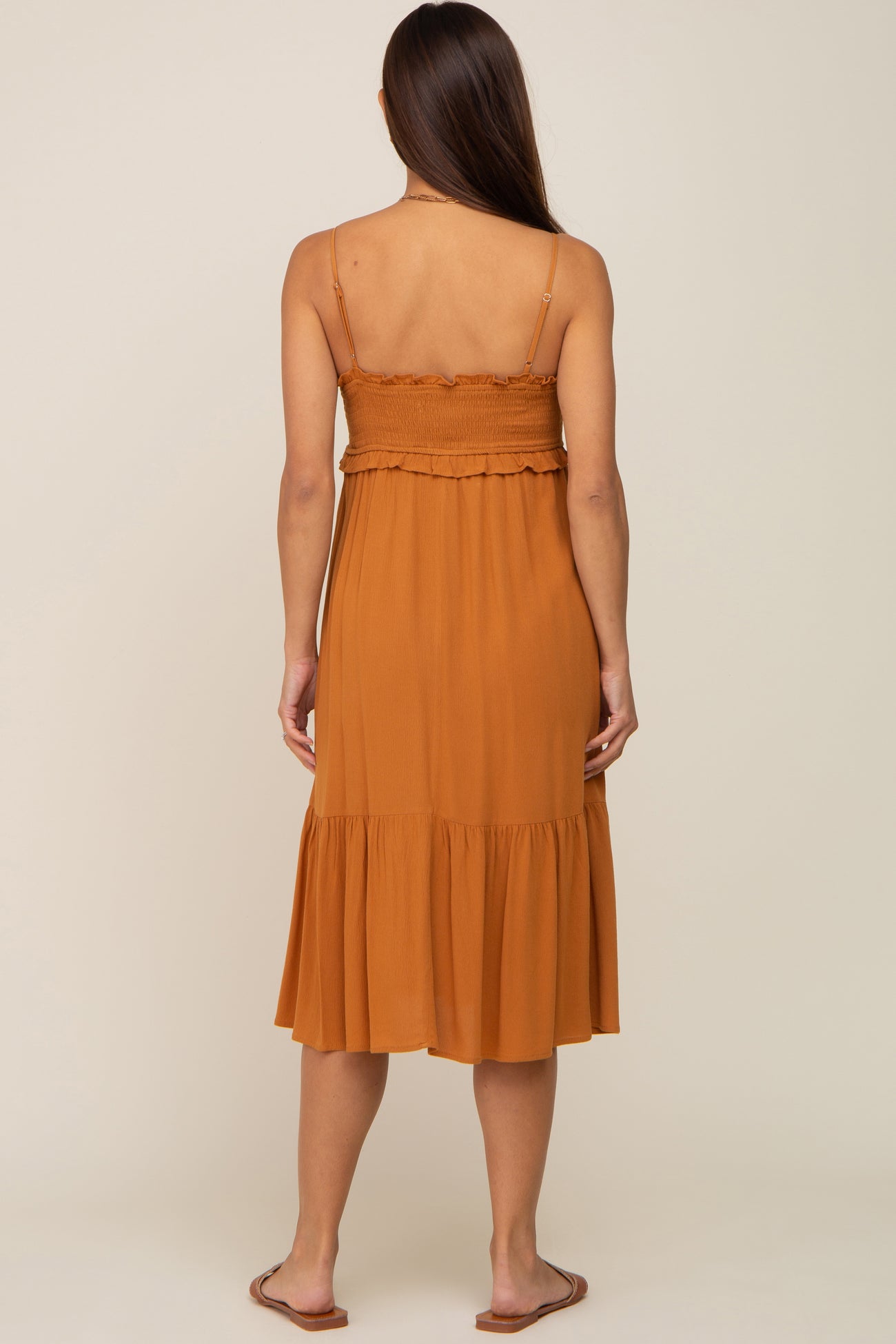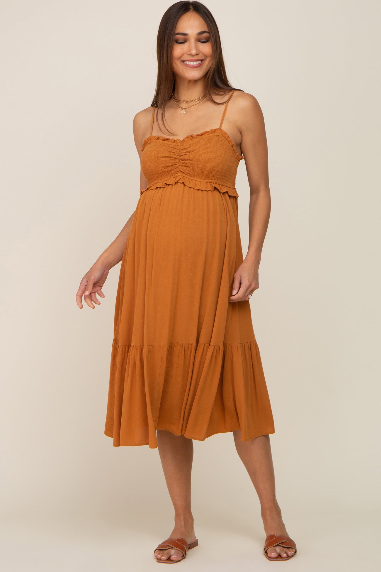 Camel Smocked Ruffle Accent Maternity Midi Dress