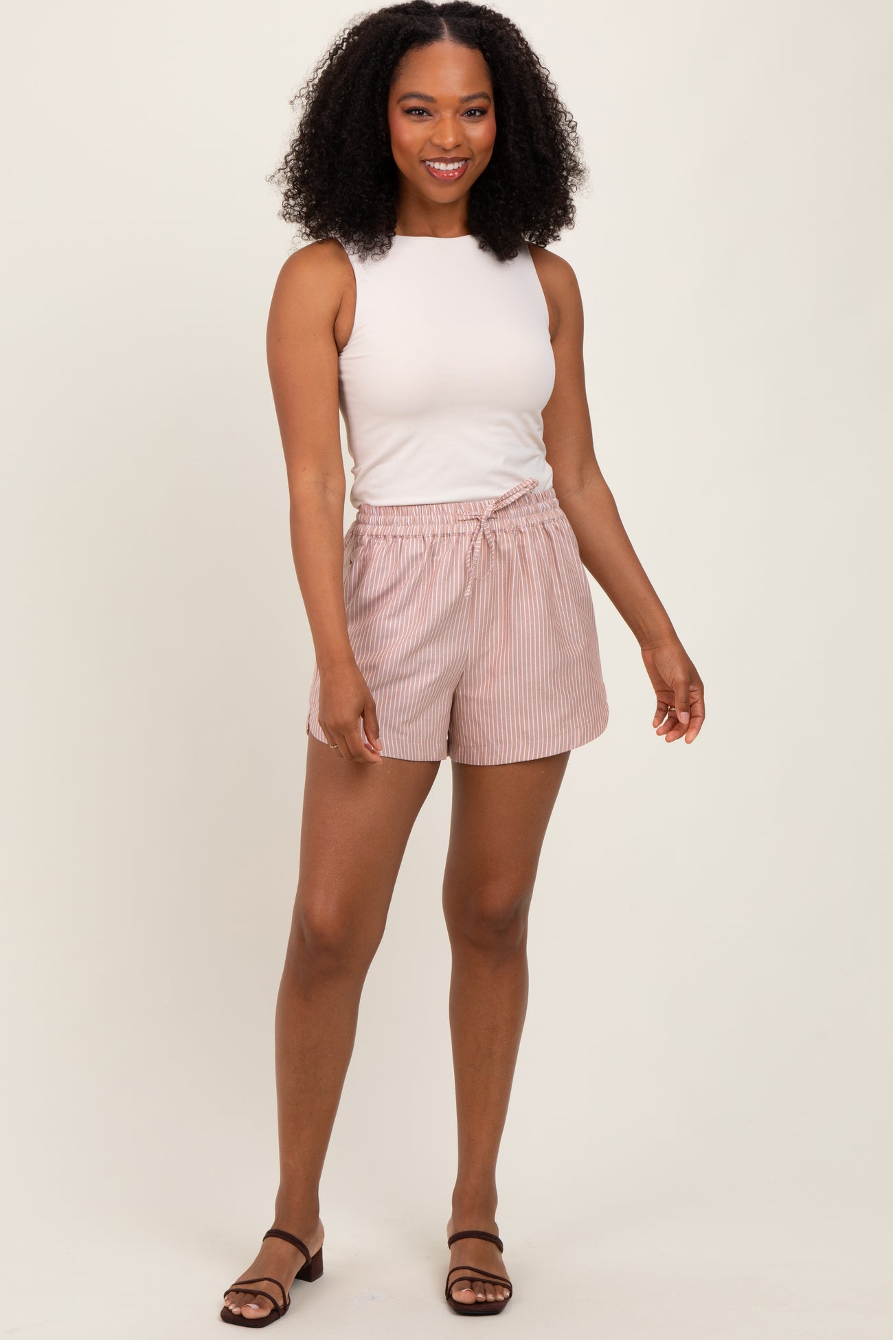 Camel Striped Round Hem Drawstring Shorts