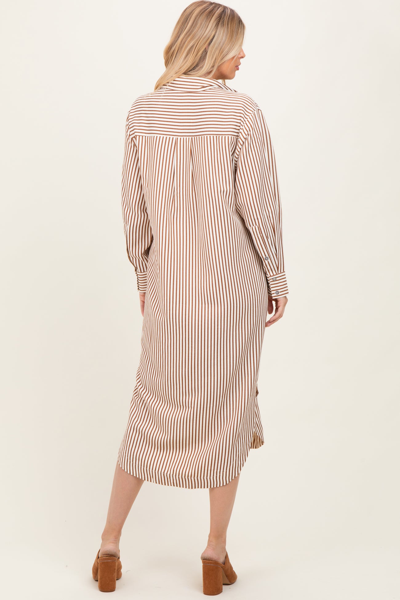 Elevate your wardrobe with this Camel Textured Stripe Button Down Shirt Dress, designed for effortless style and comfort. Featuring classic vertical stripes in warm camel tones, this midi-length dress boasts a relaxed fit with a button-down front and a pointed collar for a timeless look. The long sleeves end in buttoned cuffs, and a chest pocket adds a subtle detail to the striped pattern. Crafted from soft, breathable fabric, it’s perfect for layering or wearing solo. Pair it with sandals or ankle boots for a chic day-to-night outfit that’s both versatile and on-trend.