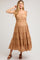 A solid maternity midi dress with self tie straps, tiered body, and ruffle accents. Dress is lined. Pocketed.