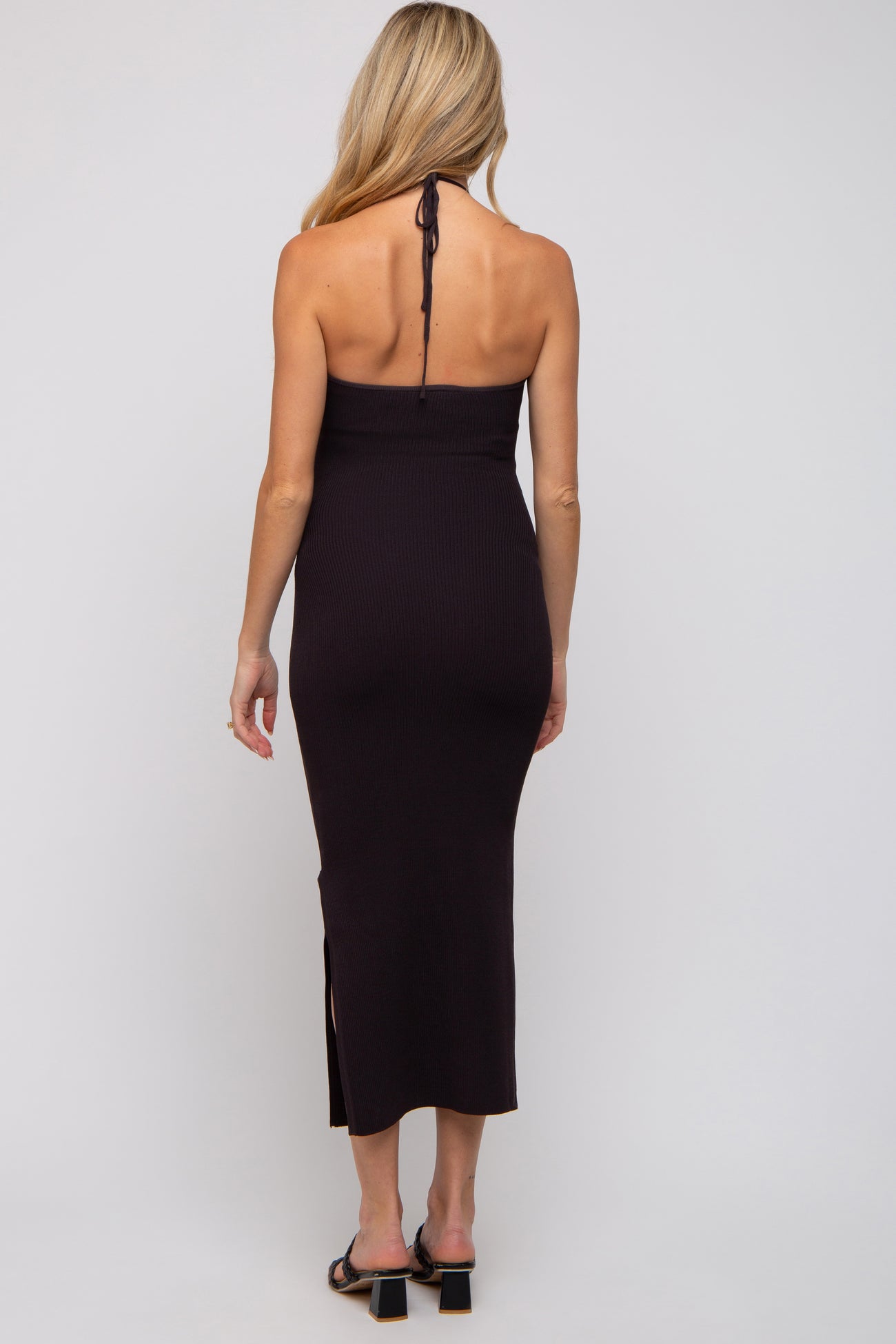 A ribbed maternity maxi dress featuring a halter neckline, a twist front accent, and a side slit.